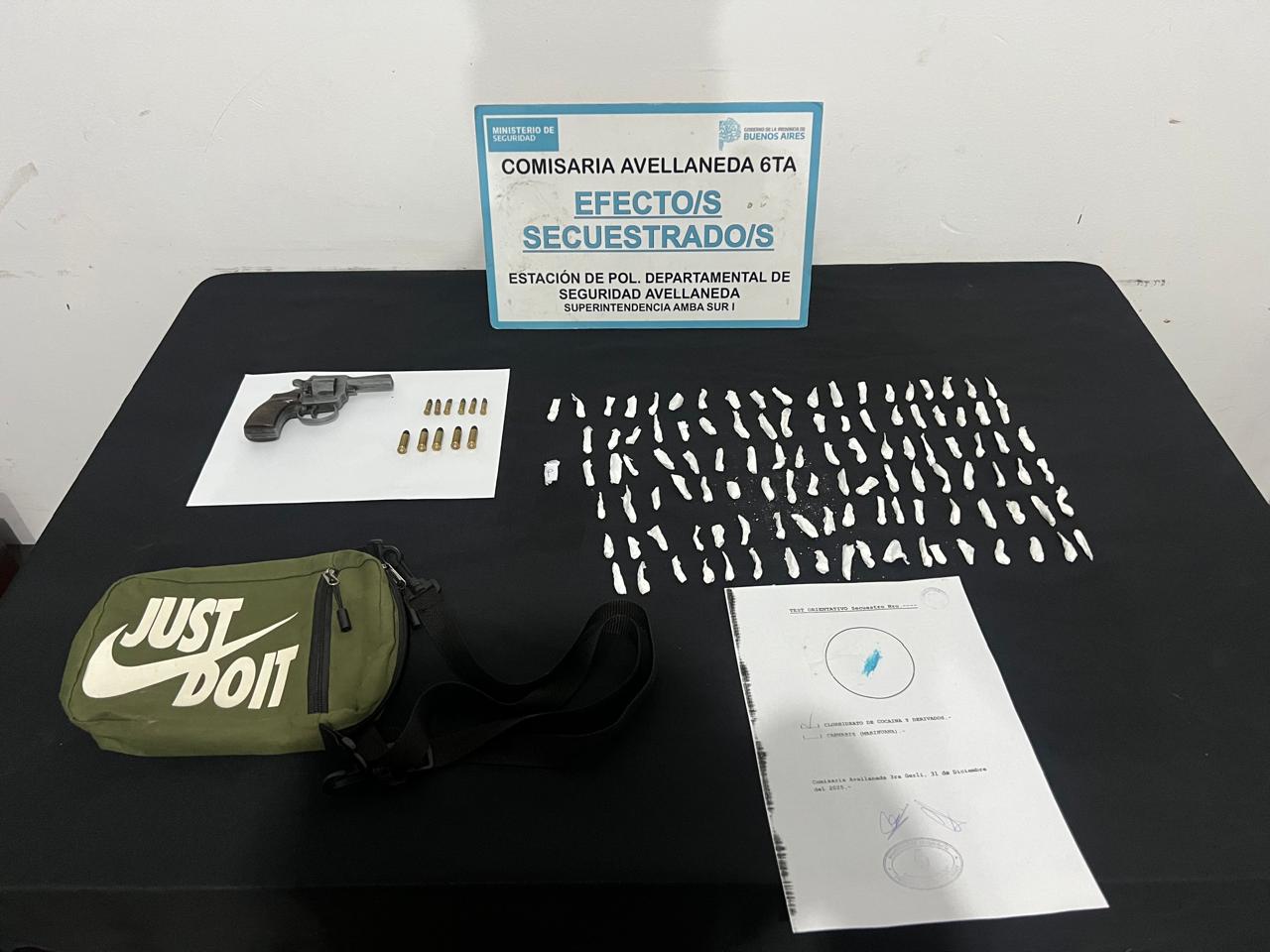 OBJETIVO 03: Camino Gral. Belgrano 6574, Wilde, (vivienda del sindicado ATILA), se procede al secuestro de un revólver Cal. 22, número de serie 273754, con 06 municiones intactas en su tambor cargado, el cual cursado por monitoreo arroja resultado negativo, 05 municiones cal. 32 y 110 envoltorios de nylon con clorhidrato de cocaina, con un pesaje de 33 gramos.