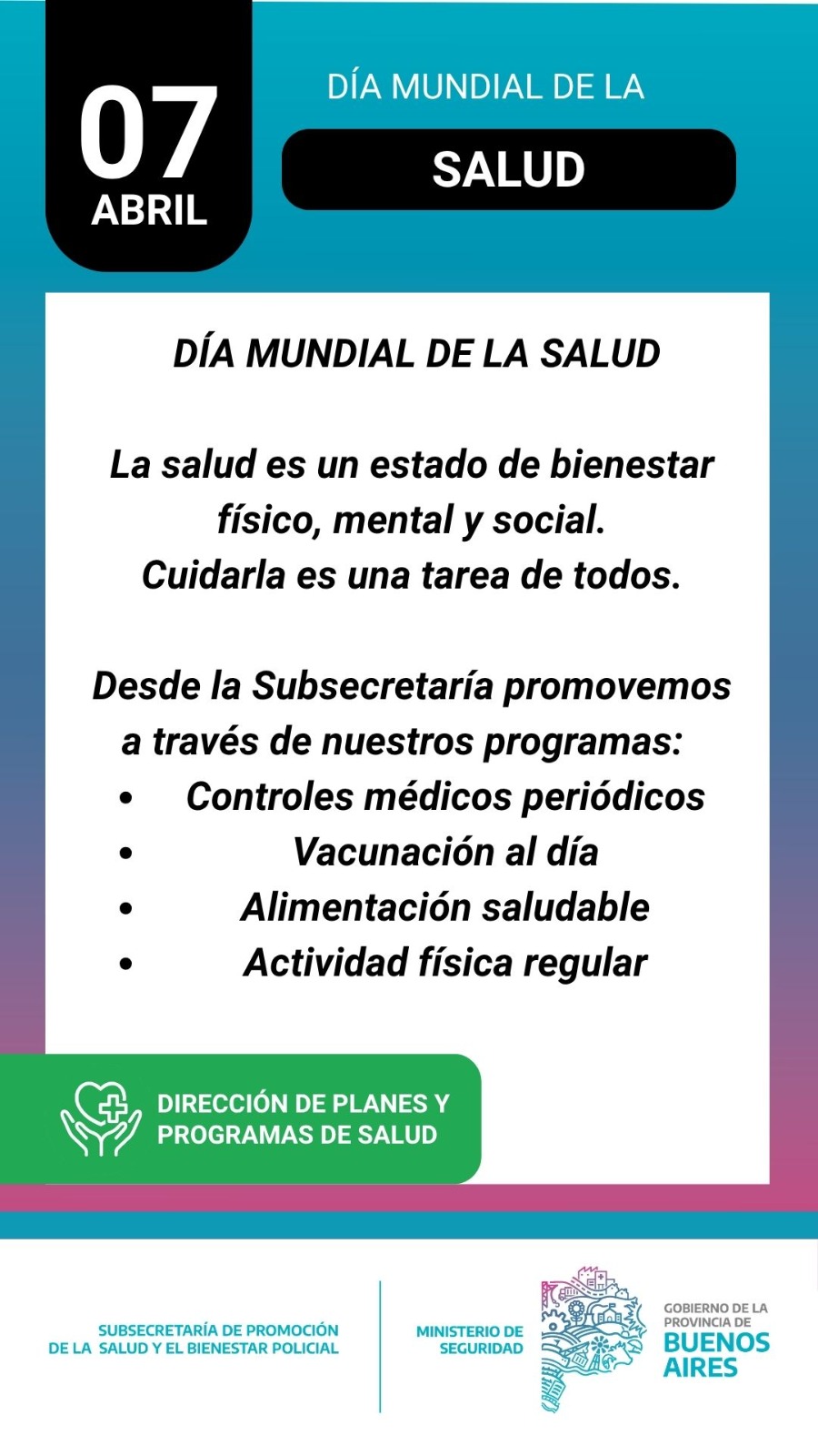 Desde la Subsecretaría de Promoción de la Salud y el Bienestar Policial a través de la Dirección de Planes y Programas de Salud realizamos jornadas de concientización, prevención y asesoramiento dirigidas al personal policial.