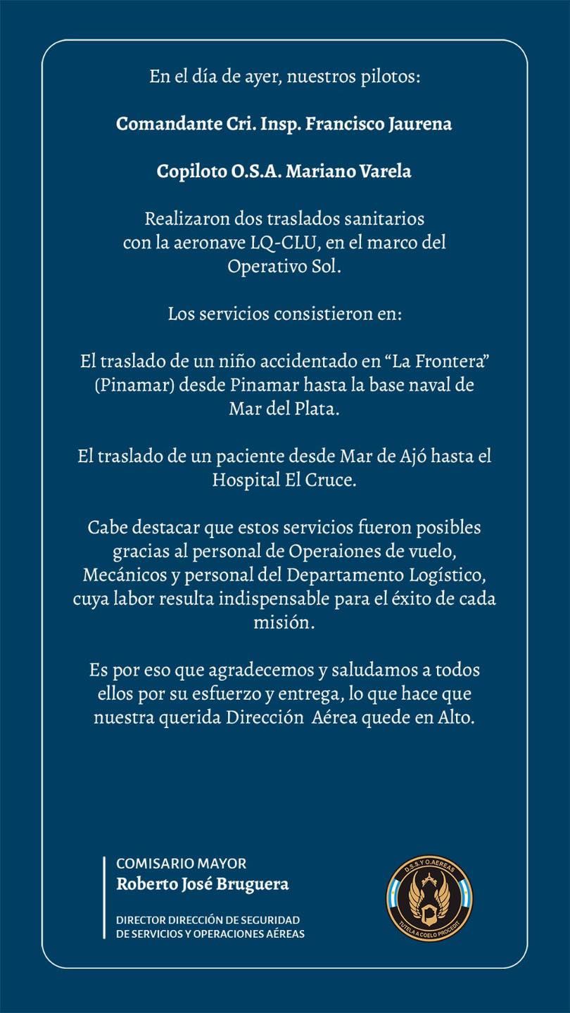 Para conocimiento de la población, sobre las actividades del personal de la Dirección de Seguridad de Servicios y Operaciones Aéreas de la Policía de la Provincia de Buenos Aires. sobre traslados sanitarios realizados en estos días.