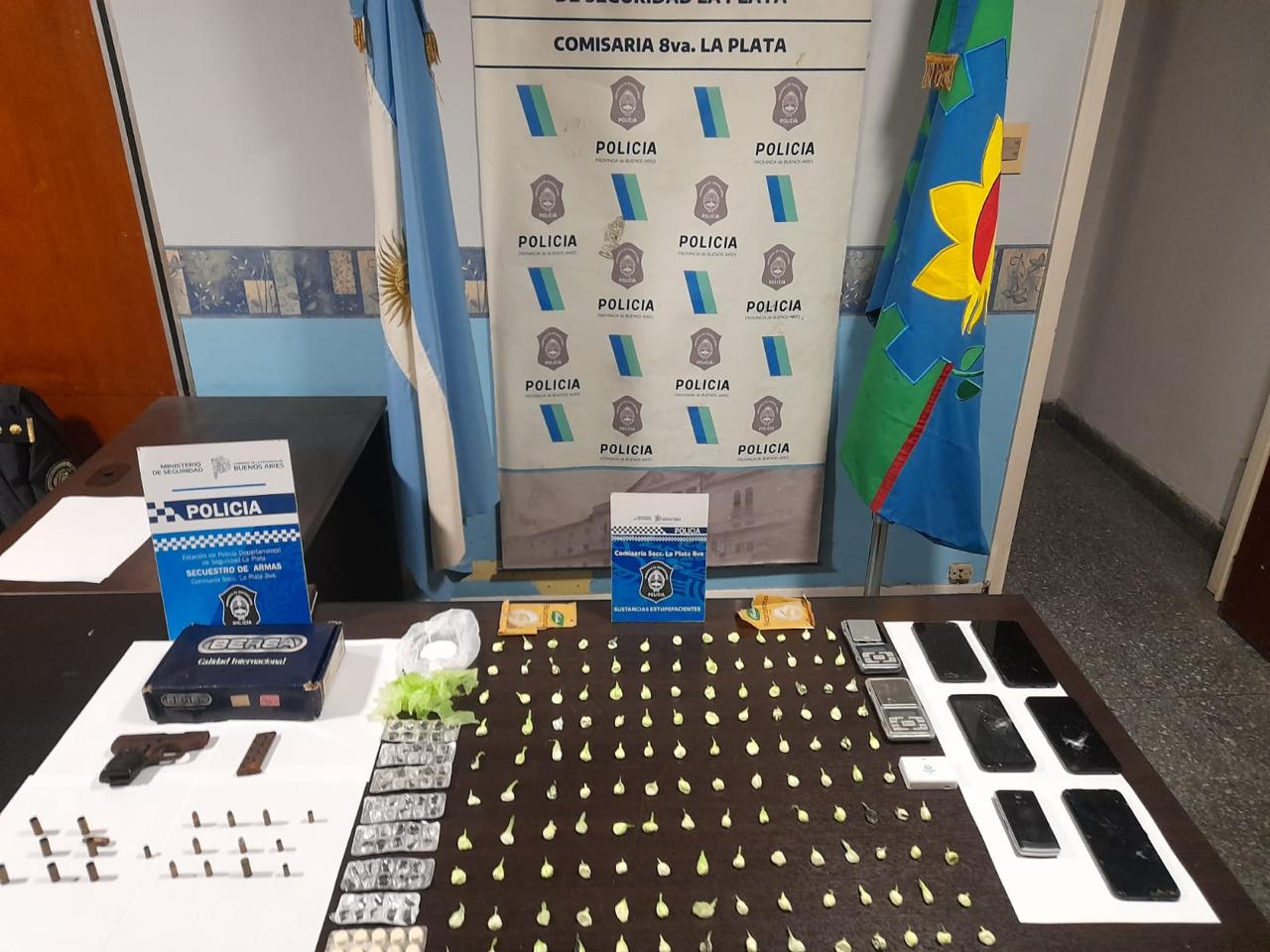Con fecha 23/01 del corriente se inició una investigación luego de haberse tomado conocimiento que una pareja se dedicaba a la comercialización de estupefacientes en el barrio de Altos de san Lorenzo. Atento esa información personal del GTO de la comisaría 8va supervisado por la UFI 18 Temática de Estupefacientes y Juzgado de Garantías 2 intervinientes del Departamento Judicial La Plata se aboco a las tareas investigativas de rigor para con el lugar en cuestión, recopilando varias horas de grabación y placas fotográficas de movimientos compatibles con el delito denunciado. Luego de haberse recolectado las pruebas suficientes fueron elevadas al magistrado interviniente que luego de haber tomado vista de las diligencias emitieron orden de allanamiento y registro a realizarse el día de la fecha para la vivienda en cuestión, dando como resultado se procede al secuestro de los elementos descriptos mas arriba y la APREHENSIÓN de los ciudadanos VERGNIAUD Eliel de 27 años y VIÑA Morena Milagros de 27 años, encargados de la maniobra ilícita. Comunicado al magistrado interviniente avalo lo actuado impartiendo directivas al respecto.