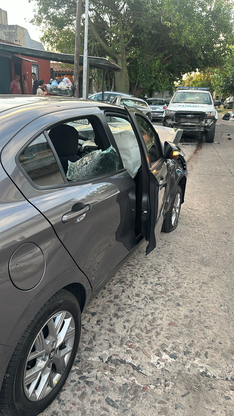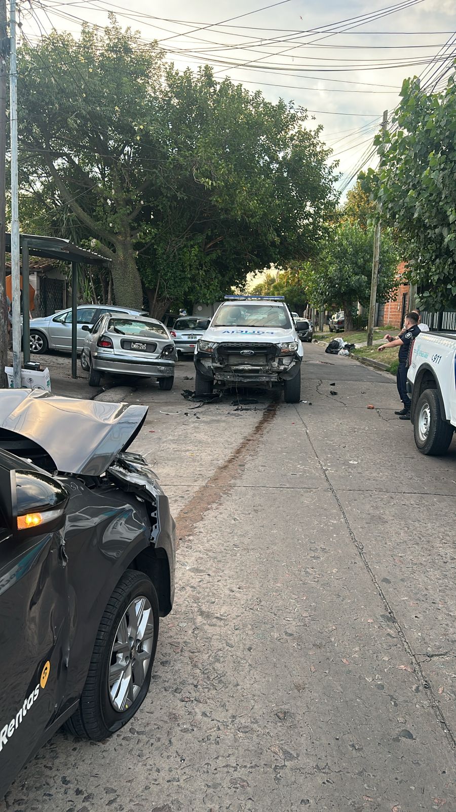 TEXTO: Se toma conocimiento mediante 911, de la circulación de una camioneta S10 recientemente sustraída en jurisdicción de Lomas de Zamora 8va. Móvil FBA XV, en Juncal y Oyuela, da vista a la misma, de la cual descienden 2 masculinos armados, quienes abordan Fiat Cronos, quedando un tercer masculino en la camioneta. Circunstancias estas en que se produce enfrentamiento armado con efvos de FBA móvil 31902 y efvos de CP Móvil 32837. Como resultado un malviviente HAF en zona de la cabeza (grave con signos vitales) al momento N.N, indocumentado, en apariencias mayor de edad, mismo trasladado por SAME hacia Htal Vecinal con custodia policial y un segundo masculino aprehendido refirió ser y llamarse ALEJO SIMÓN L. (17). En la huida colisionan móvil de CP RO. 32837 Sgto Ruiz Verónica y Ofl Pol Moya Nicolás, trasladados al Htal Vecinal con dolor zona cervical, asimismo embisten otros 2 vehículos estacionados. Dentro de Fiat Cronos gris se observa en asiento del acompañante arma de fuego (revólver cal. 38) Personal FBA ilesos. Camioneta S10 habida en Chascomús y Pje 1 de Barrio El Ceibo sin ocupantes. Interv. Fiscalía Menores 6 LZ Dr Bonilla, dispuso pericias se lleven a cabo por Gendarmería Nacional). Se aguardan demás directivas del Sr. Fiscal.