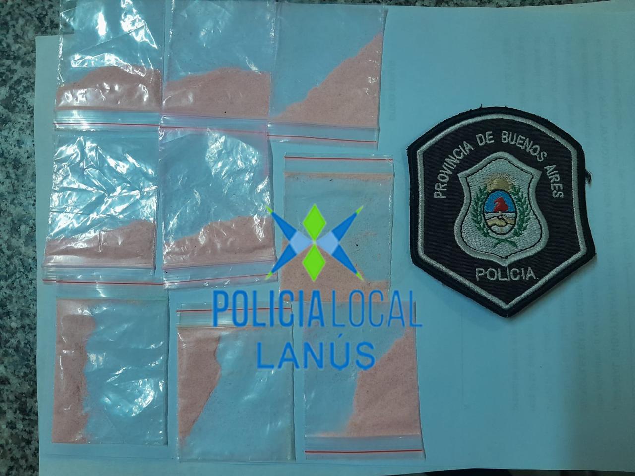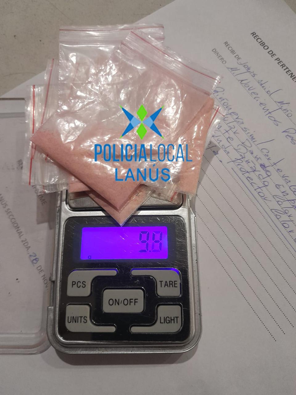 Cca. UPPL Lanús, fecha, personal de este elemento caminante en prevención, en las intersecciones de las calles 9 de julio y Anatole france, visualizan un masculino el cual realiza pasamano con otro sujeto, el cual se logra rápidamente su identificación, aportando que en el momento de la misma, se encontraba aglomeración de adolescentes motivo festivo UPD, logrando la aprehensión de MIÑO JONAS ADRIEL (arg, 18 años), a quien se le incauta la cantidad de 09 sobres de droga TUSSI (cocaína rosa), se procede a la aprehensión y posterior traslado a la seccional Lanus 2da, una vez allí se procede a realizar el pesaje de la sustancia en su contenido, arrojando un total de 9.4 gramos de TUSSI, se labran actuaciones mención epígrafe.
