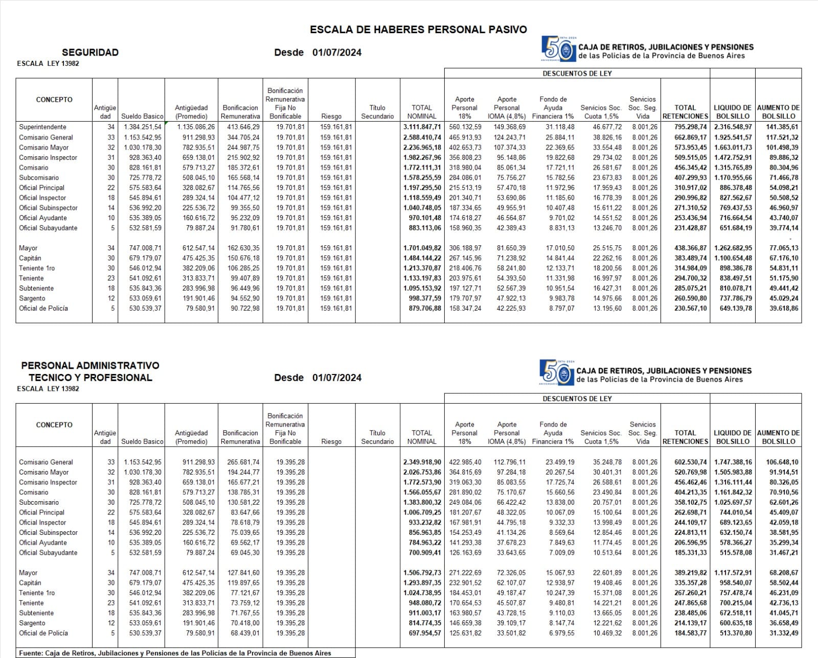 Con los haberes de Agosto, que se percibirá el 2do. día hábil del mes de Setiembre 2024, la Caja de Retiros, Jubilaciones y Pensiones de las Policías de la Provincia de Buenos Aires hará efectiva la escala de haberes pautada para Julio 2024 por el Gobierno Provincial para el personal de las Policías de la Provincia de Buenos Aires.