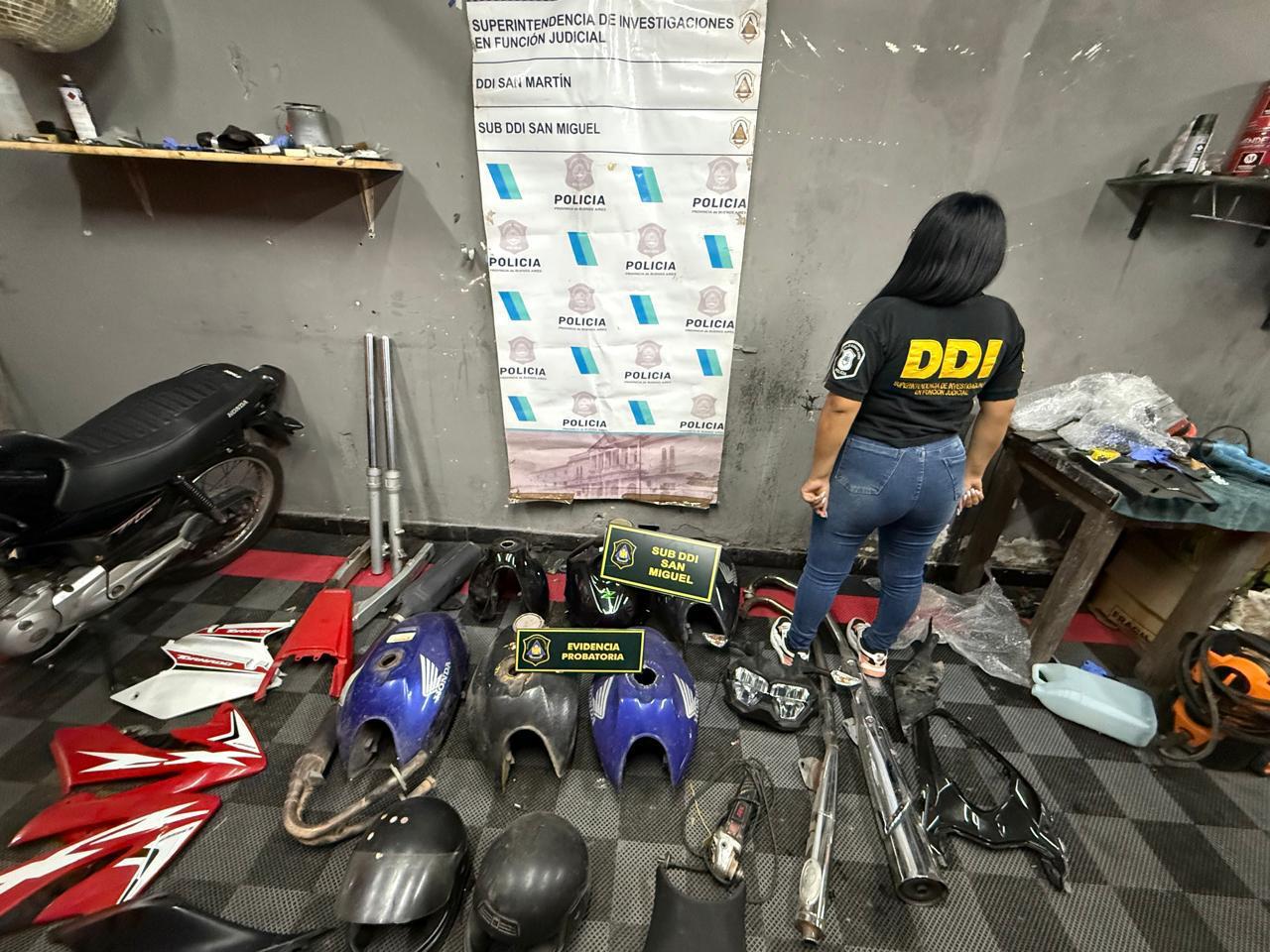 Secuestros: celular, prendas de vestir, motopartes (8 tanques de nafta, cachas plásticas, manubrio, horquilla, juego de apoya pie, soporte de baulera, 3 asientos, 5 caño de escape, 2 apoya pie, 2 llantas, 4 cascos, 3 espejos y faro delantero), herramientas (llaves dif. medidas, picoloro, pinza, llaves Allen)