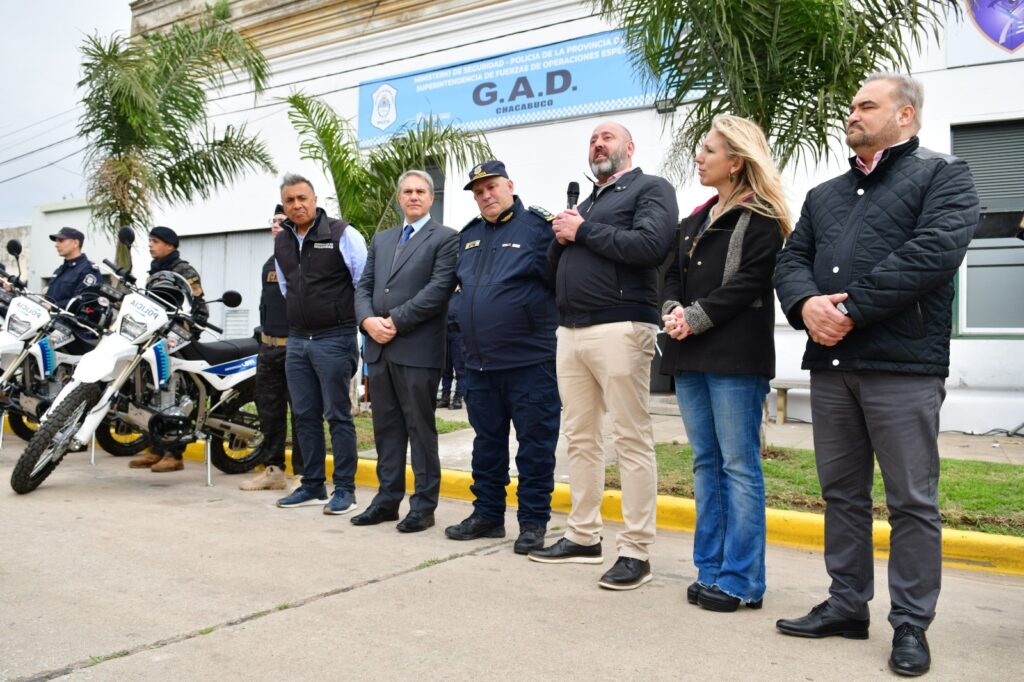 En Chacabuco, acompañados por el intendente Darío Golia, entregamos nuevas motos de policía que refuerzan el trabajo de prevención en cada barrio e inauguramos la nueva base del Grupo de Apoyo Departamental.