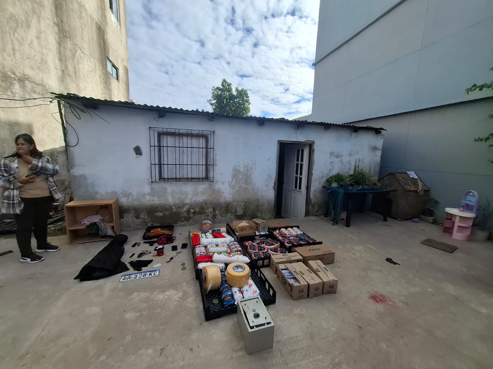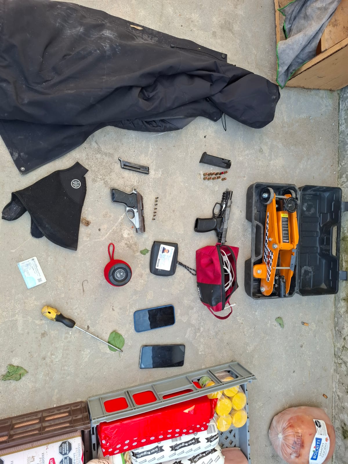 EXTRACTO: Fecha informa UPPL Avellaneda, que móvil de esta División en recorrida preventiva, ámbito Cría Avell.5ta.- en las arterias Lynch y Lucena toman conocimiento que momentos antes dos sujetos a bordo de vehículo VW Gol habían sustraído camioneta Peugeot Boxer dom. EPO 468 cargada con mercadería de embutidos y chasinados. A raíz de ello inician rastrillaje donde ocasionales señalan hacia asentamiento lindero de Bernal, hallando en el trayecto a las víctimas, identificadas como: ABEL E, arg., 45 años e IGNACIO N., arg., 20 años, los cuales certifican que acababan de sustraerles dicho rodado, por lo cual al realizar recorridas por el lugar, observan que frente a la vivienda de Psje. Pilcomayo sin nro. e/ 171 y 172 de Bernal, se hallaba la camioneta en cuestión junto a rodado VW Gol dom. colocado ELQ 424 (estableciendo posteriormente por grabados que el real es GHD 349 con PEDIDO DE SECUESTRO ACTIVO de fecha 06/04/2026 en hecho ROBO AUTOMOTOR de cria. Quilmes 7ma. que circula bajo ISN 3276695), donde dos sujetos se hallaban trasladando los embutidos desde el interior de la camioneta hacia la vivienda donde se hallaba quien fuera posteriormente identificada como ANTONELLA, arg., 27 años. Por ello se da la voz de ALTO POLICÍA, donde ambos arrojan elementos y se dan a la fuga hacia el interior de la vivienda, donde personal policial ingresa tras ellos, los cuales acceden a viviendas precarias lindantes, logrando salir a correr, donde el personal policial sigue a uno de ellos a quien logra aprehender en calles Lynch y Malvinas Argentinas (unos 400 mts.), tratandose de RUS JUAN CARLOS en cuyo poder se secuestro la llave del rodado VW Gol. Asimismo, de los elementos que estos arrojan, se secuestro una pistola cal. 09 mm. con cargador serie 13F07387 (sin pedido de secuestro) con cargador y 11 proyectiles, ademas una pistola cal. 22 serie 2624 (sin secuestro) con cargador y 07 proyectiles. Asimismo, se secuestro dos telef. celulares, una chapa ptte. AA228KC (corresponde a rodado VW con PEDIDO DE SECUESTRO ACTIVO en hecho ROBO AUTOMOTOR de fecha 20/04/26 a requerimiento de Cria. Quilmes 2da. que circula bajo ISN 3279684) y la totalidad de embutidos y chasinados sustraídos. Se dio conocimiento a Dr. González – UFI 04 Av., quien dispone aprehensión del causante en orden ROBO AGRAVADO POR SER MERCADERÍA EN TRÁNSITO Y POR EL USO DE ARMA DE FUEGO EN CONCURSO REAL CON ENCUBRIMIENTO (hecho modalidad «PIRATERÍA DEL ASFALTO»), serie de recaudos legales y restitución de rodado y mercadería a propietario. Es cuanto informo.