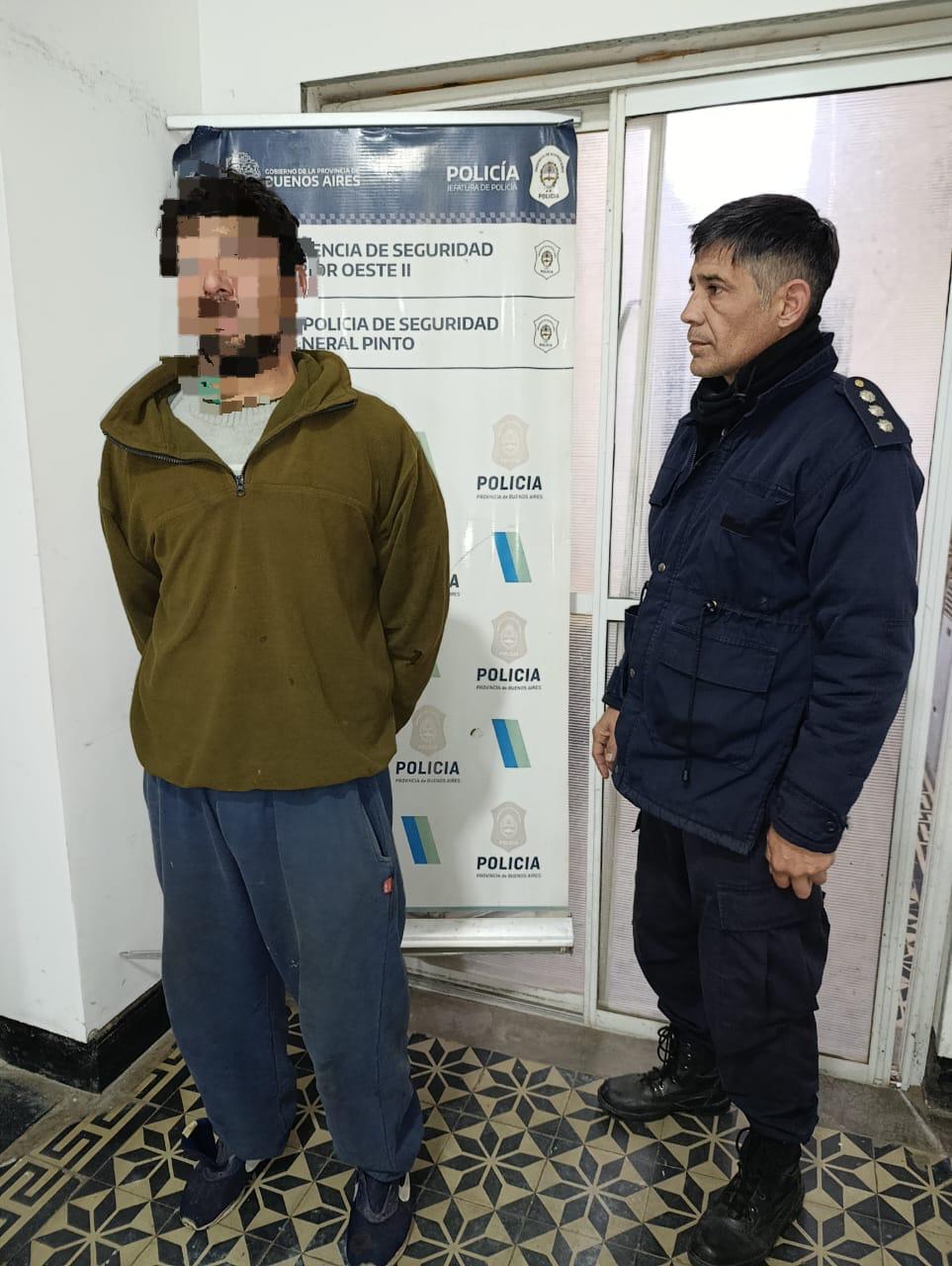 SÍNTESIS: Fecha personal esta y Gto Pinto, en cto OSE nro 1/26, en calle Rivadavia y San Martín, proceden a la Aprehensión de MALDONADO SERGIO DANIEL (34) dlio. General Pinto, virtud registrar pedido captura Paradero activo a req. Juzgado de Paz Letrado Gral. Pinto, de fecha 17/10/25, c-1775-JP2025, por Inf Ley 8031/73. Cto juzg intervención, dispuso comp 05 cte primera audiencia. Rec legales.