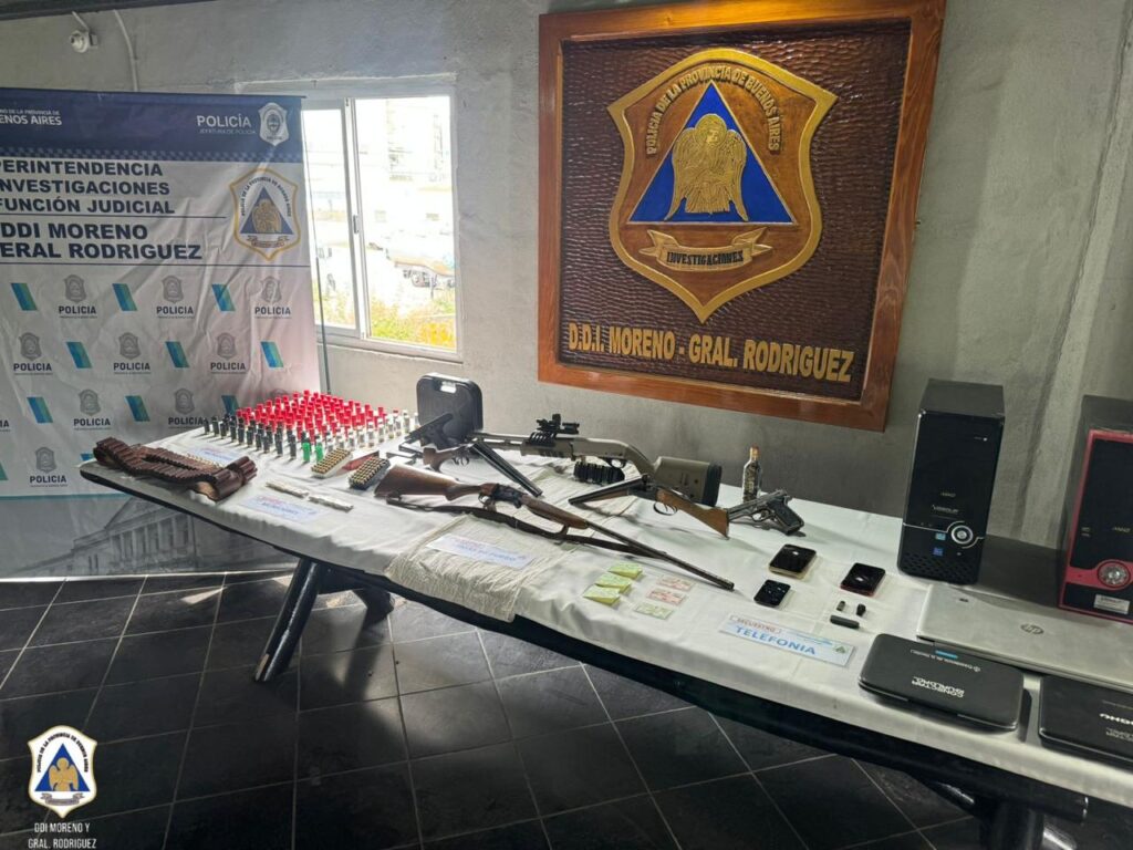 En consecuencia, personal de la DDI Moreno-Gral. Rodríguez comisionado a los fines de realizar tareas investigativas, logró obtener 3 Ordenes de Allanamiento y detención para el Imputado Hernán G.S. de 48 años y el secuestro de pistola GLOCK cal. 9mm c/2 cargadores, 181 proyectiles cal. 9mm, escopeta Remington Marine Magnum cal 12/70, replica de pistola, 2 pistolones de cañón recortados, 224 cartuchos cal 12/70, 3 celulares, dispositivos de almacenamiento, 3 Notebook, 2 CPU, 3 pendrive, 2 cinturones porta cartuchos y documentación varia.