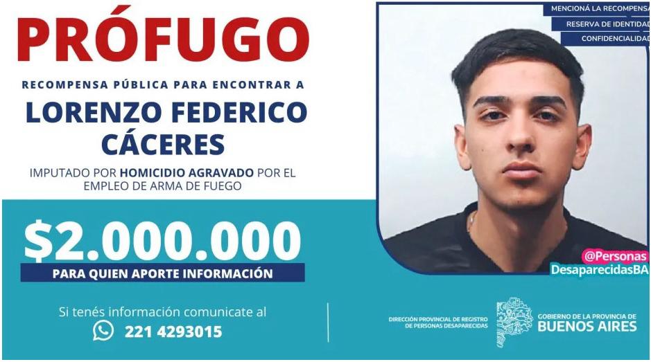Tras tareas desplegadas e identificar al imputado Lorenzo Federico Cáceres, de 22 años, se obtuvo O.Detención y se insertó recompensa pública de $2.000.000 otorgada por el Ministerio de Seguridad de la Provincia de Bs As.