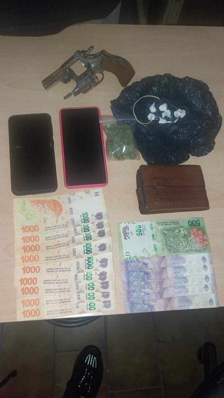 Personal del GTO de la comisaría 1ra de Hurlingham divisan una moto con dos sujetos merodeando por las paradas de micros, quienes al tratar de ser identificados tratán de darse a la fuga logrando su interceptación en calle Solís y Minoguyen; Procediéndose a la aprehensión de Cajal Garzón Hernán de 29 años y Gómez Nahuel Leandro de 21 años a quienes se le secuestra un 01 revólver Pasper cal. 22 sin cartuchos; 08 envoltorios con cocaína pesaje total 8 grs; 01 envoltorio con marihuana pesaje 1,8 grs; la suma de $11.000 mil pesos y el moto vehículo con el que se movilizaban Zanella 110cc. ptte 861-HSI.