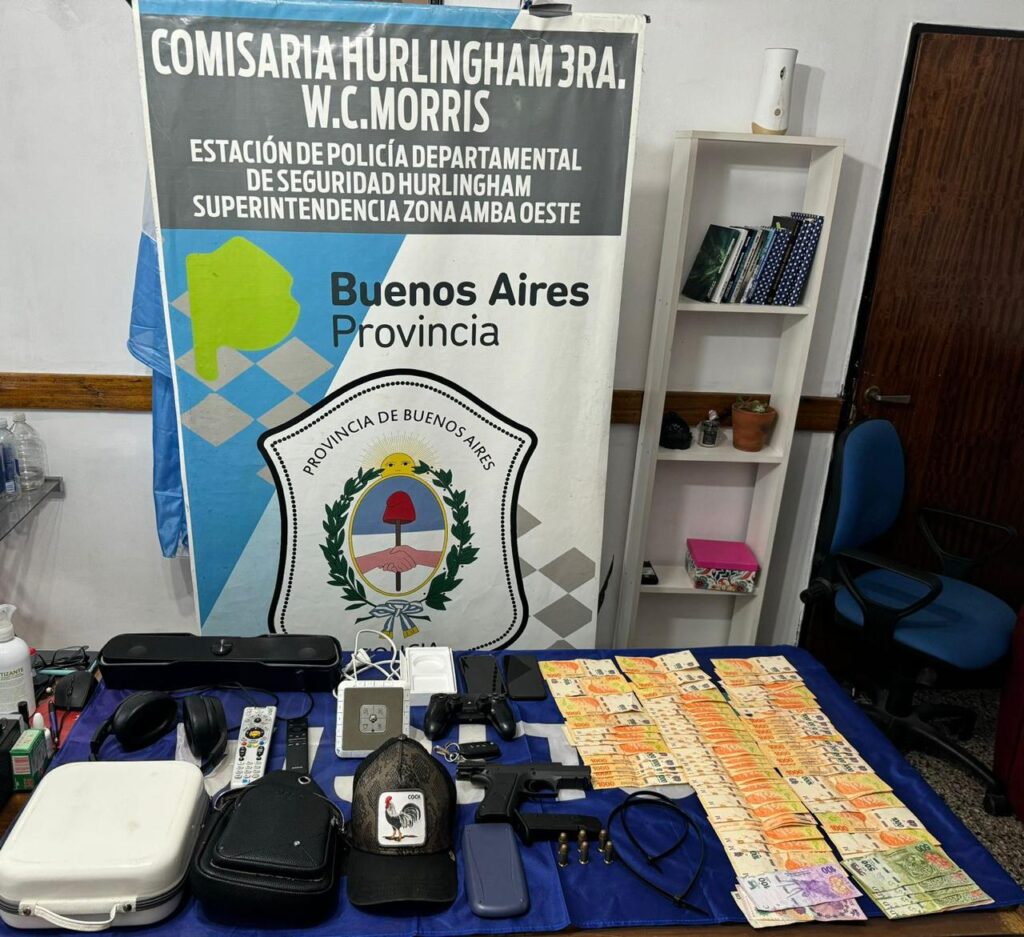 Personal policial procede a la aprehensión de Silva Jonatan, dargentino de 23 años y Silva Ariel quienes se encontraban en el interior del domicilio de la vivienda ubicada en Fariña 2418 esquina Arribeños, de Williams Morris quienes son rápidamente aprehendidos por Personal Policial, secuestrándose en poder de ambos una pistola calibre 45 Pistola marca Jericho mod 941FS Serie Nro J9001362 con 6 proyectiles en su almacén cargador y elementos sustraídos en el interior de la vivienda. Asimismo se procede al secuestro de Motovehiculo marca Mondial Ptte A194CJL (vehículo con el cual los delincuentes llegaron al lugar del hecho). Int.: UFI 05 Morón, actuaciones comisaría 3ra Hurlingham.
