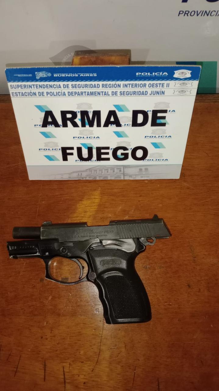 Fecha, Pnal. Sec. Cdo. Pat. comisionado a Ameghino N°1459 procedieron a la aprehensión de ALCARAZ MAXIMILIANO GASTÓN (33), quien instantes antes, circunstancias mismo se hallaba alcoholizado, agrede físicamente a su pareja SARGENTO (E.G.) ROCIO Y. (36),para sustraer de interior de placard su arma reglamentaria BERSA THUNDER ULTRA COMPACT PRO, para efectuar disparo en interior de garaje, e intentar darse a la fuga con pistola sustraída dañando mediante patadas portón del mismo.- Aprehendido, vaina servida y arma secuestradas trasladadas a Cría. Sec. Segunda.- Ccado. mag. interv. disp. IPP carátula epígrafe, notif. Alcaraz form. causa, alojamiento y traslado fecha 30/12 cte. a primer audiencia en sede tribunalicia.- Vtma. trasladada a CMyF Junín.- Interv. UFI N°01 Depto. Judicial Junín.- Ccado. Dra. Rebuffo Aud. Zonal 3 AGAI no adopta temperamento para con efectivo policial.