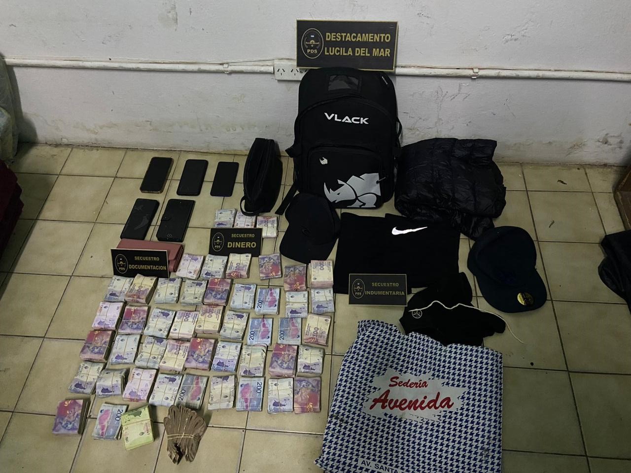 Fecha personal en recorrida en calle Rivadavia Nro. 76 de Costa Azul, es interceptado por damnificada quien refiere que instantes antes 7 masculinos irrumpen en su domicilio y reducen a 3 moradores, sustrayendo $ 1.500.000, dos celulares, mochila negra, billetera de mujer y un neceser negro. Fugando en Peugeot 308 blanco. Se inicia protocolo cerrojo, rodado visualizado por COM San Bernardo, se comienza persecución y en calle 49 e/8 y 9 de Sta. Teresita interceptan vehículo descendiendo todos los ocupantes, lográndose aprehender a 3 de ellos, y al secuestro de 6 celulares, mochila negra, neceser negro, billetera con documentación de victima, $ 591.000 efectivo, 3 cuellos, 2 gorras y una campera. Rodado Peugeot 308 plateado, corresponde a Ptte AA466ML, con PSA de UFI 01 Lomas de Zamora, de fecha 29-04-24, NSI 3090132. Mant. com. Dr. M. Prieto UFID N° 2, dispone, aprehensión. Se continúa tareas fines ubicar resto autores y arma utilizada.