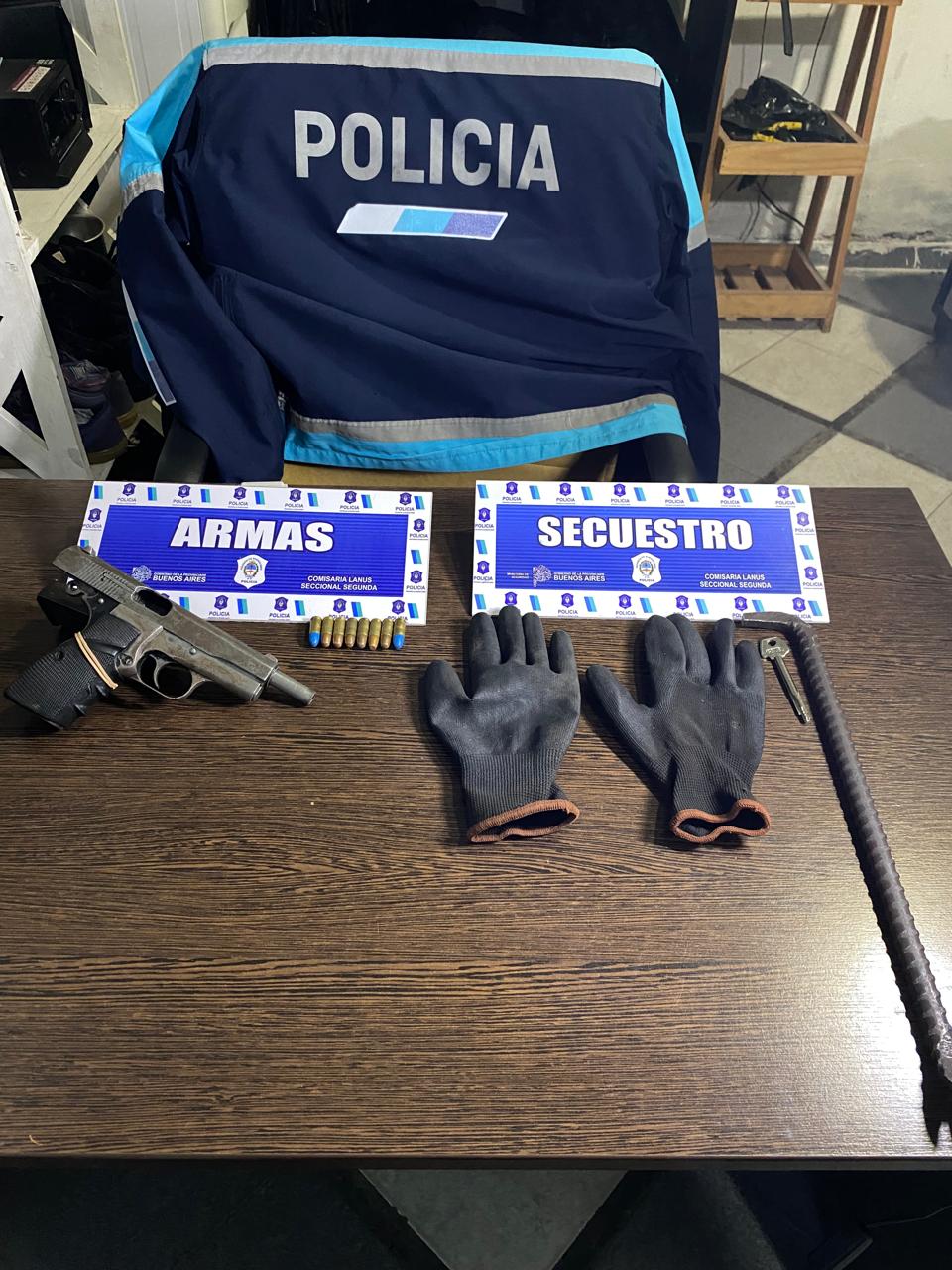 Cca. Cria. Lanús 2da, fecha, personal de GTO de este elemento, proceden a la aprehensión de DILAN RODRIGO MOLINA, 24 años, ddo. Pedernera al 2300, quien se hallaba a bordo de Peugeot 205 ptte. WGU149 (sin impedimentos), en presencia de un testigo se procede a requizar el vehículo, hallando oculto un arma de fuego tipo pistola marca Browning cal. 9 mm con numeración suprimida y 8 cartuchos intactos, también se halla una barreta, un par de guantes y una llave. Se procede al secuestro de todos los elementos como así también del rodado. Mantenida comunicación telefónica con el Dr. Rodríguez, UFI 06 desc. Lanús, quien dispuso se labren actuaciones Tenencia ilegal de arma de guerra, dejando aprehendido al masculino, debiendo ser conducido sía de mañana a sede judicial.