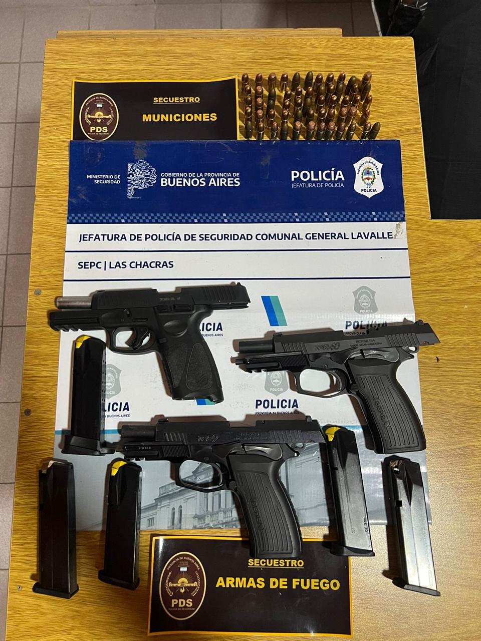 Fecha 12/01/25 cdo PU 12391/25 en cuál vtma. Arnaldo A. de 75 años denuncia en esta dependencia que el día 11/01/25 ingreso a una chacra vecina donde aloja sus equinos y un vecino le refiere que no quiere verlo mas ahí y escucha una detonación de arma de fuego en dirección a su persona. Dando origen a IPP 03-00-000225-25/00 a lo cual llevada a cabo tareas investigativas se logro certificar la autoría del hecho, otorgando Juzg. Gtias. 2 Dolores, orden allanamiento para con OBJETIVO 1) sito en calle 44 N° 615 e/calle 6 y 7 de Santa Teresita OBJETIVO 2) sito en calle 47 e/ 26 y 32 de Las Chacras, misma llevada a cabo bajo O.S 198/25, arrojando resultado POSITIVO, procediendo al secuestro de OBJETIVO 1) una PISTOLA SEMIAUTOMÁTICO MARCA BERSA MODELO TPR 40 CALIBRE 40 PLG SMITH & WESSON AUTO NÚMERO SERIE J64854 CON 9 MUNICIONES; PISTOLA SEMIAUTOMÁTICA MARCA BERSA MODELO TPR9 CALIBRE 9MM PARABELLUM NÚMERO DE SERIE J10108 CON 16 MUNICIONES; PISTOLA SEMIATOMÁTICA MARCA TAURUS MODELO G3 CALIBRE 9 MM PARABELLUM NÚMERO ACE962490 CON 16 MUNICIONES; DOS CARGADORES Y 12 MUNICIONES y se procedió en OBJETIVO 2) al secuestro de 5 cartuchos de escopeta calibre 16 intactos y 2 percutados y un cinto porta cartucho. MPF dispone se proceda a la notificación de la formación de la causa por el delito de AMENAZAS AGRAVADAS POR EL USO DE ARMA.
