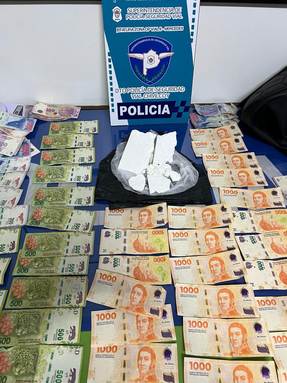Fecha., Hora actual, bajo S.S.V.O.S. 01/24, Ruta Nac. 5 y acceso a Chivilcoy, se intercepta vehículo Volkwagen, mod. Gol, color gris, ptte. HOL-083 Conductor/aprehendido FERNÁNDEZ ALAN, arg, ( 31 años), Ddo. Calle Matheu Nro. 2220 Villa Maipú San Martín. Acompañante/aprehendida SHARON MAGALI MARTÍNEZ, arg. 30 años, Ddo. calle Fray Cayetano Nro.2800 Ciudadela, requizado interior del rodado, se procede al SECUESTRO* del interior del habitáculo en forma oculta una bolsa de nylon transparente conteniendo sustancia; en dos trozos compactos, de color blanco, tést orientativo CLORHIDRATO DE COCAÍNA, peso total 781 grs., dinero en efectivo $137.770pesos y tres teléfonos celulares. Interv. UFI. 3 Dr. Illanes Pedro y ayudantía Fiscal de Estupefacientes, Ambos Departamento Judicial de Mercedes. Dispuso secuestro de todos los elemento y vehículo. Aprehendidos junto con actuaciones el día 18/03/24, 08:00hs. a sede Judicial. Asimismo aprehendida Martínez posee en su contra Pedido de Captura Activo bajo ISN 267101, causa Nro. 4760 injerencia Juzg. Crim Nro4 Cap. Fed
