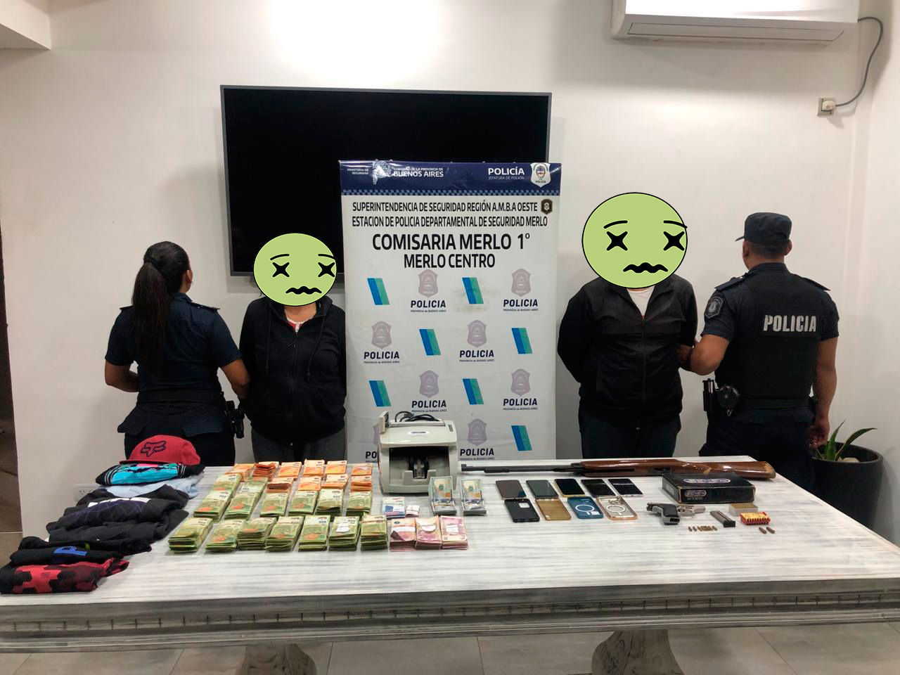 GTO de comisaría 1ra de Merlo tras el análisis de las cámaras establece que autores se movilizaban en un VW Fox ptte. AC-925-QN identificando así a sus tenedores como familia Soria obteniéndose orden de allanamiento para su ddo. Efectuado el registro se aprehende a Soria Hernán José Luis de 41 años junto a su esposa Funcia Marcela Mariel de 44 años por los delitos mencionados y se identifica a su hijo menor. A quienes se le secuestra el vehículo utilizado en el hecho VW Fox, como así también 01 pistola Bersa Thunder cal. 22 serie A76986 cargada con 8 municiones mismo cal.; 02 cajas de municiones cal. 22; 01 rifle de aire comprimido; prendas que vestían utilizadas en el día del hecho; 5 celulares; varias autopartes no registradas de “Jeep-Ford-Toyota-Volkswagen-Renault-Fiat”; tres motovehiculos 01 motor Yamaha con n° suprimida y otra moto Honda y Yamaha sin doc. que acredite pertenecías; varias documentaciones, 01 cuadriciclo Yamaha raptor sin doc.; 01 máquina contadora de billetes, 04 bicicleta sin factur, 01 monopatín eléctrico sin doc.; varias herramientas nuevas sin facturación; la suma de $ 2.505.900 pesos; USD 16.643 dólares y 01 camioneta VW Amarok V6 ptte. AD646SA a los fines periciales sobre sus numeraciones registrales.