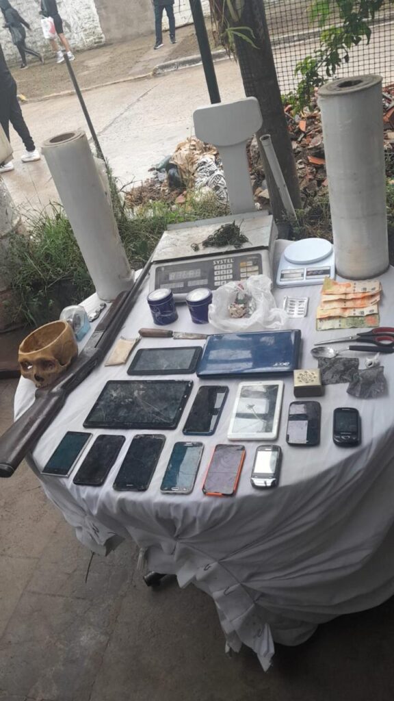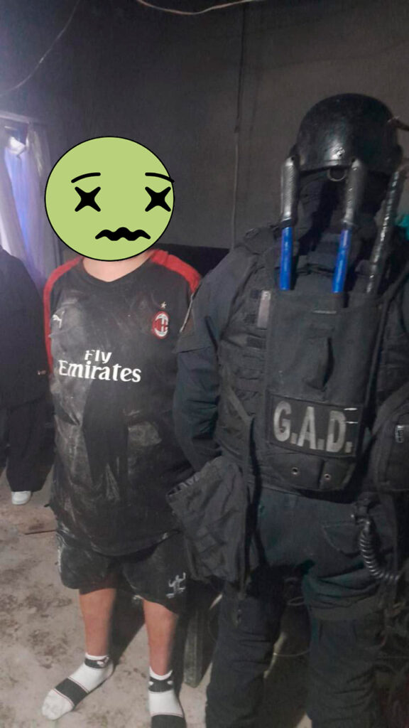 GTO juntamente con DDI local, logran identificar al N.N Gordo Mario Osvaldo Julián Rojas Aranda de 39 años, donde con anuencia del MPF UFI 05 Morón procede allanar en urgencia su ddo. en calle San Benito 2209, donde se procede a la aprehensión del imputado quien se le sec.: 01 escopeta cal 16 utilizada en el hecho, varios cartuchos, 01 balanza de precisión, 01 balanza digital, 02 tablets, 01 computadora, elementos de corte y 09 celulares que serían utilizados para la venta de estupefacientes; 7,5 grs. de marihuana; papeles con resto de cocaína y dinero en efectivo.