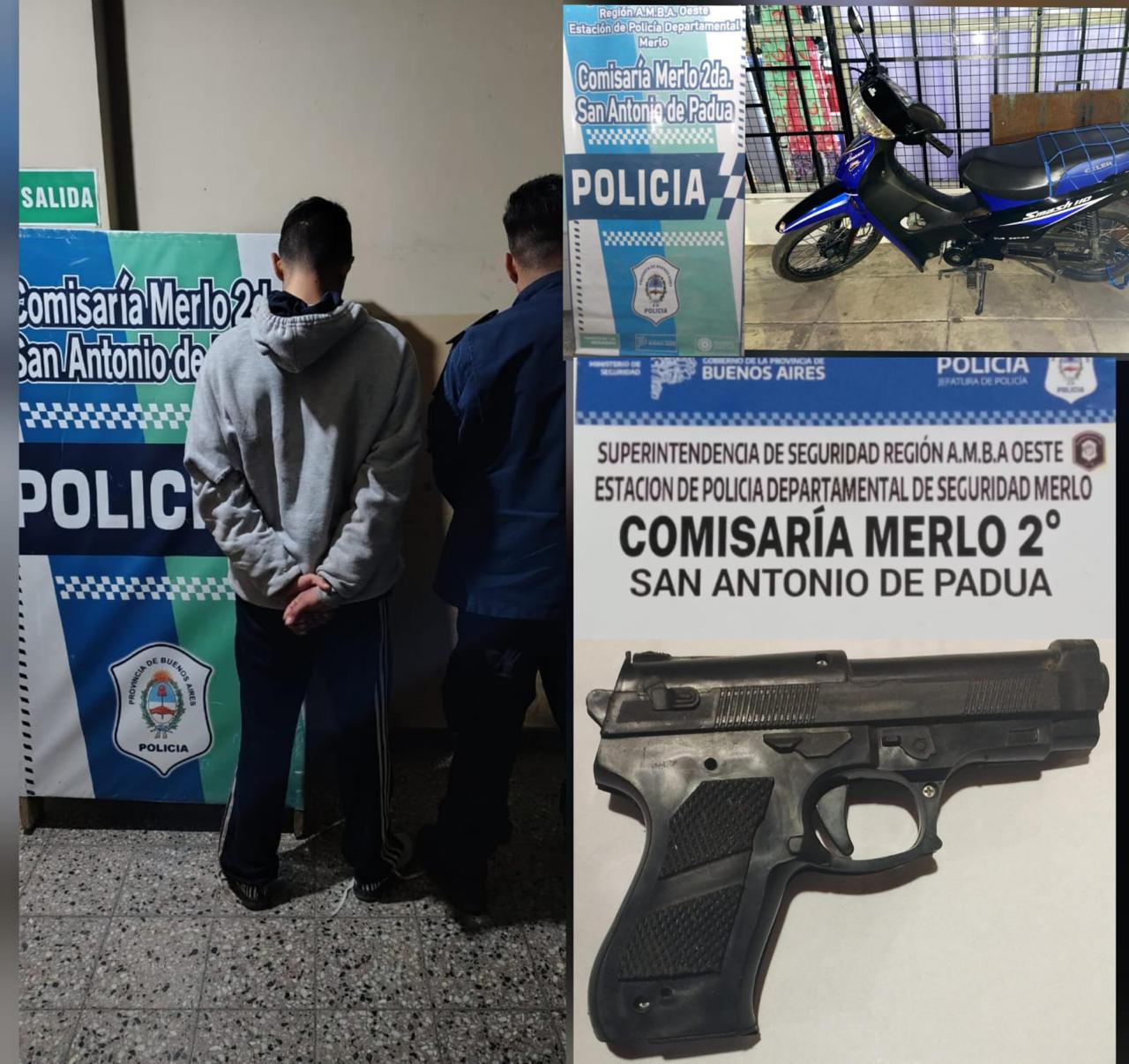 SINTESIS: Fecha personal policial dando cumplimiento OSE nro. SSRAO 1 00-220/25 OPERATIVO PREVENCIÓN MODALIDAD MOTOCHORROS/SATURACIÓN DE BARRIOS en Baravino y Billiken proceden a la aprehensión de MAXIMILIANO C. (15)quien junto a otro masculino (Prófugo) a bordo de motovehículo, intentan mediante intimidación de arma de fuego (replica de plstico liviano) sustraerle motovehiculo Gilera Smash de color azul ptte. A180OCS Vtma. ABRIL en Billiken y Echeverría. Vtma. Ilesa. Int. URPJ nro. 1 Morón Dr. Iturri dispone diligencias de rigor y entrega de menor a progenitores.