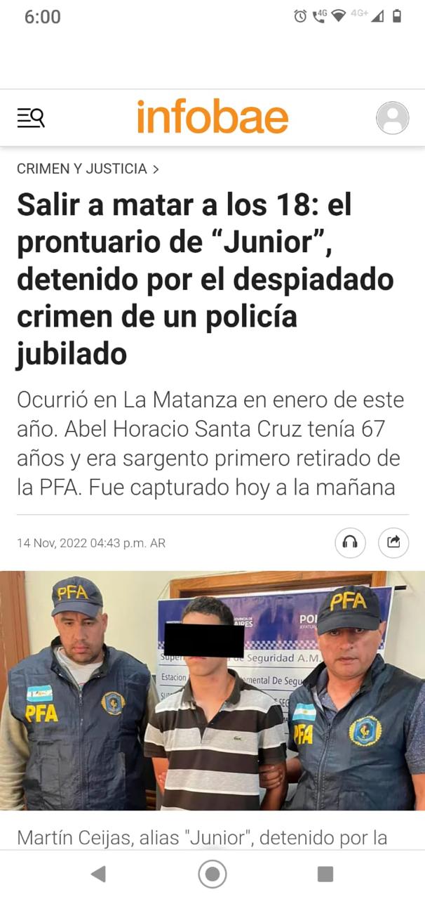 Personal policial es requerido en Hospital de Morón, por el ingreso de masculino herido arma de fuego en el tórax, al arribo lo identifican cómo Demian Isaías A. (17) dónde se trata de establecer las circunstancias del hecho, el mismo varía en su relato refiriendo incongruencias en el suceso. Personal Policial ante esta situación procede a realizar averiguaciones donde establece la correcta identidad de A. quien resulta ser y llamarse: Ceijas Martín quien Registra Orden de Captura con fecha 03-01-24 por Homicidio Calificado Criminis Causa, Robo Calificado por el uso de arma de fuego en Poblado y en Banda, y con fecha 07-03-24, se solicitó la captura internacional por parte de UFI del Joven 2 de La Matanza. Mismo resulta ser autor del Homicidio del Sgto. 1ro. (Retirado) de PFA Abel Horacio Santa Cruz, acaecido 22-02-2022 ocurrido en Rafael Castillo quien incumplió la prisión domiciliaria dispuesta en su domicilio calle Escalada 5033 de San Justo.