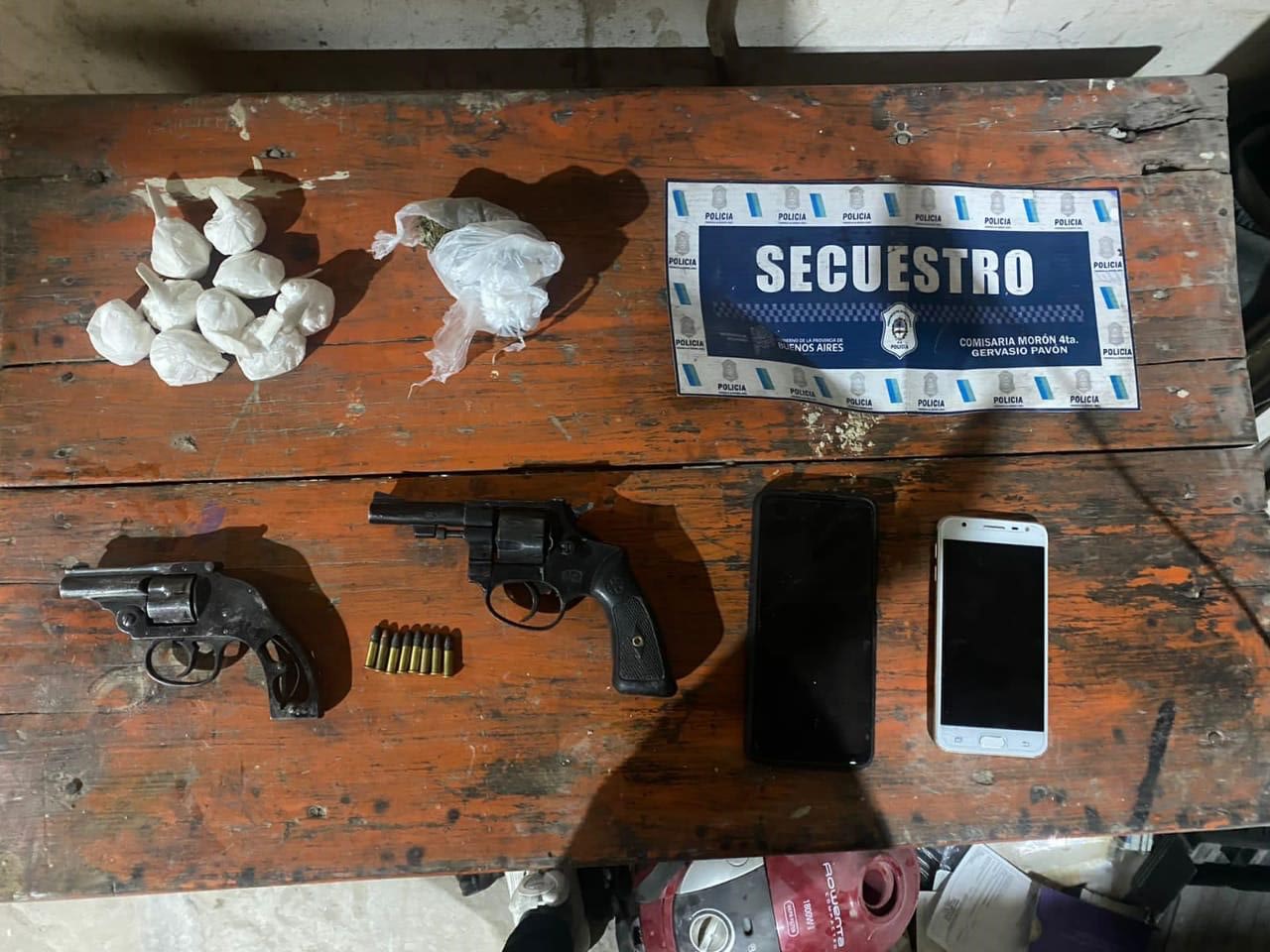 Personal del Comando de Patrullas y GTO, en Achaga y Río Cuatro, avistan un sujeto en Chevrolet Corsa ptte. EOF-571, el cual fuga al intentar ser identificado, se inicia seguimiento hasta Arana 3340, donde conductor desciende e ingresa a la vivienda, logrando en su interior aprehensión de PACHILLA Rubén Darío de 42 años (conductor), y de moradoras; CORIA Mía de 19 años y RODRÍGUEZ Patricia Mabel de 50 años, quienes se tornaron hostil ante presencia policial, se les incauta 94 grs. de cocaína fraccionadas, 12 grs. de marihuana, dos celulares, un revólver Galand M.R. cal. 22 largo serie W556G s/imp., con 8 proyectiles mismo calibre, un revólver SY W cal. 32 serie 270243 s/imp., en el patio se incauta varias auto partes y automóvil Peugeot 208 ptte. NTH032, registra Secuestro por Robo de fecha 27/02/2024 a stud. Cría. La Matanza 6ta. MPF dispuso secuestro de sustancia – armas y rodados, notif. Art. 60 CPP, solo aprehensión de PACHILLA y demás medidas de rigor.
