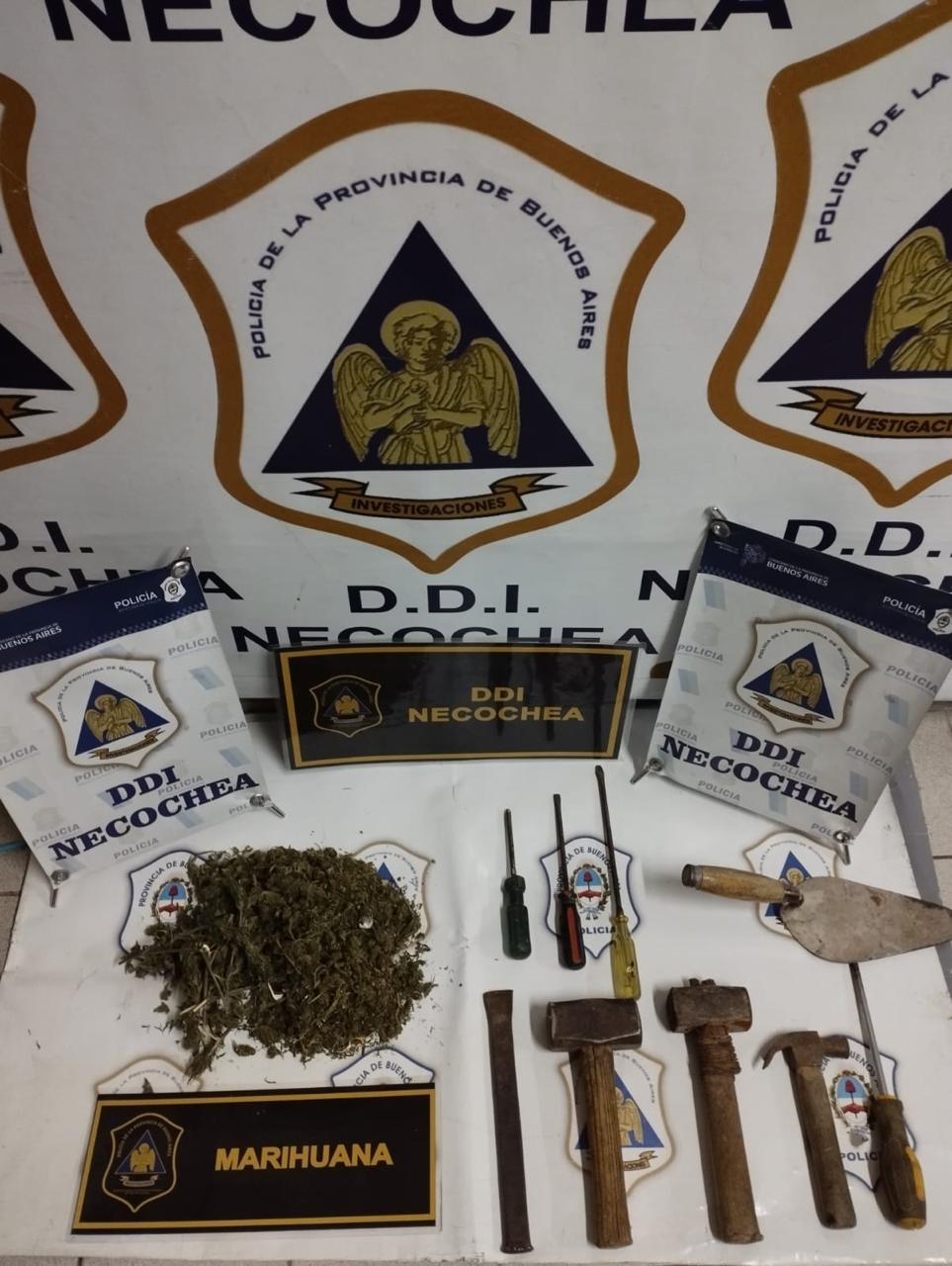 Raíz denuncia fecha 3 del cte., Dte. LUCIANO P. (39), refiere que se encuentra remodelando una vivienda de su propiedad sita C/79 al 3900, estando en obra y deshabitada, que habiendo dejado la misma cerrada al regresar constato el faltante la puerta de acceso y varios elementos, entre ellos, herramientas de mano y eléctricas, sanitarios y mampostería que se hallaba sin colocar y a resguardo dentro del lugar. De tareas investigativas, declaraciones testimoniales y relevamiento de cámaras, se obtiene fotograma del que se logra individualizar autores y establecer domicilios de interés. Ante probanzas UFI N° 3 solicito ordenes de allanamiento. Otorgadas por Juzg. Gtias. N° 2, Dpto. Judicial Necochea. Efectivizadas en la fecha se procedió en OBJ. 1) identificados moradores, no hallando elementos de interés del registro. OBJ 2) Se identifico a sindicado SANTANA HUGO ADRIÁN, de 25 años, del registro del predio se efectuó secuestro de 130 gs de Marihuana y herramientas descriptas en ítem que se corresponden con las sustraídas. Inicio Act. por INF. Ley 23737. Secuestro y aprehendido trasladado sede esta DDI fines dar cumplimiento a los recaudos legales.
