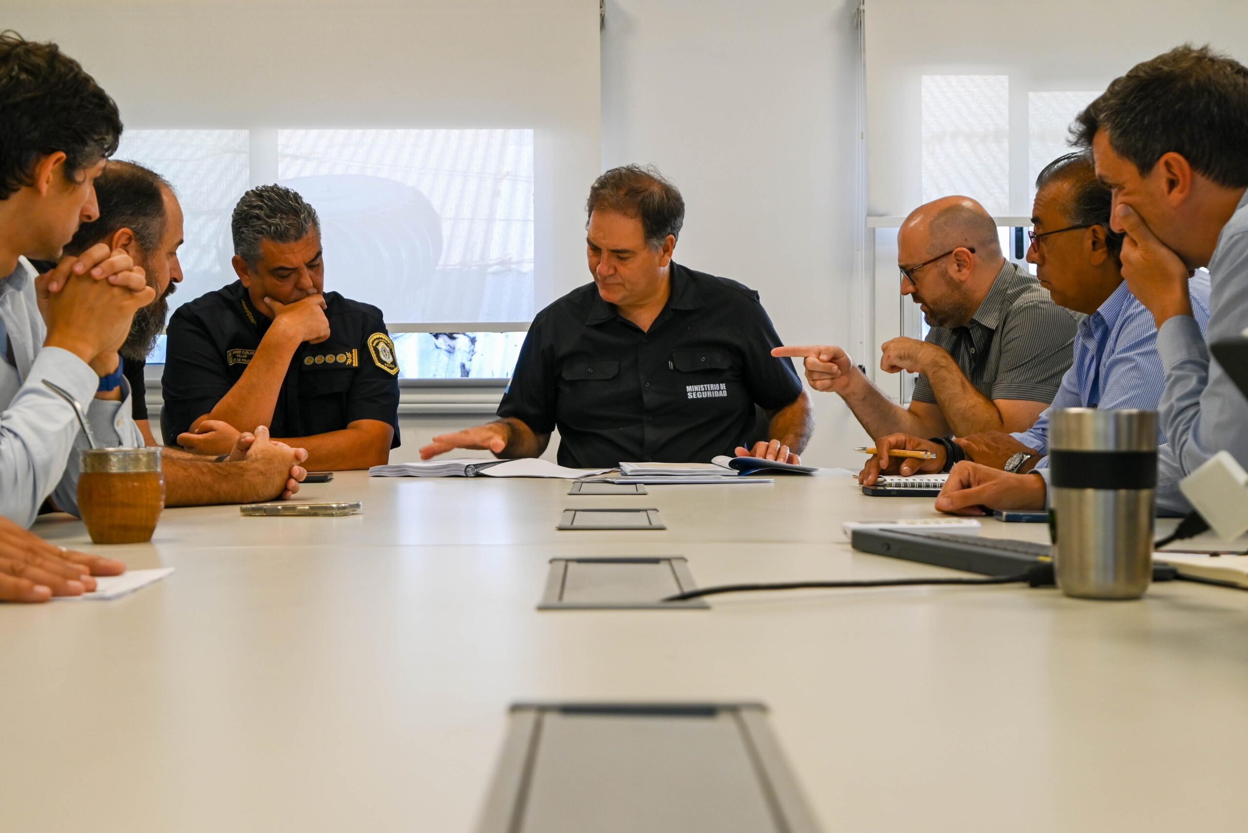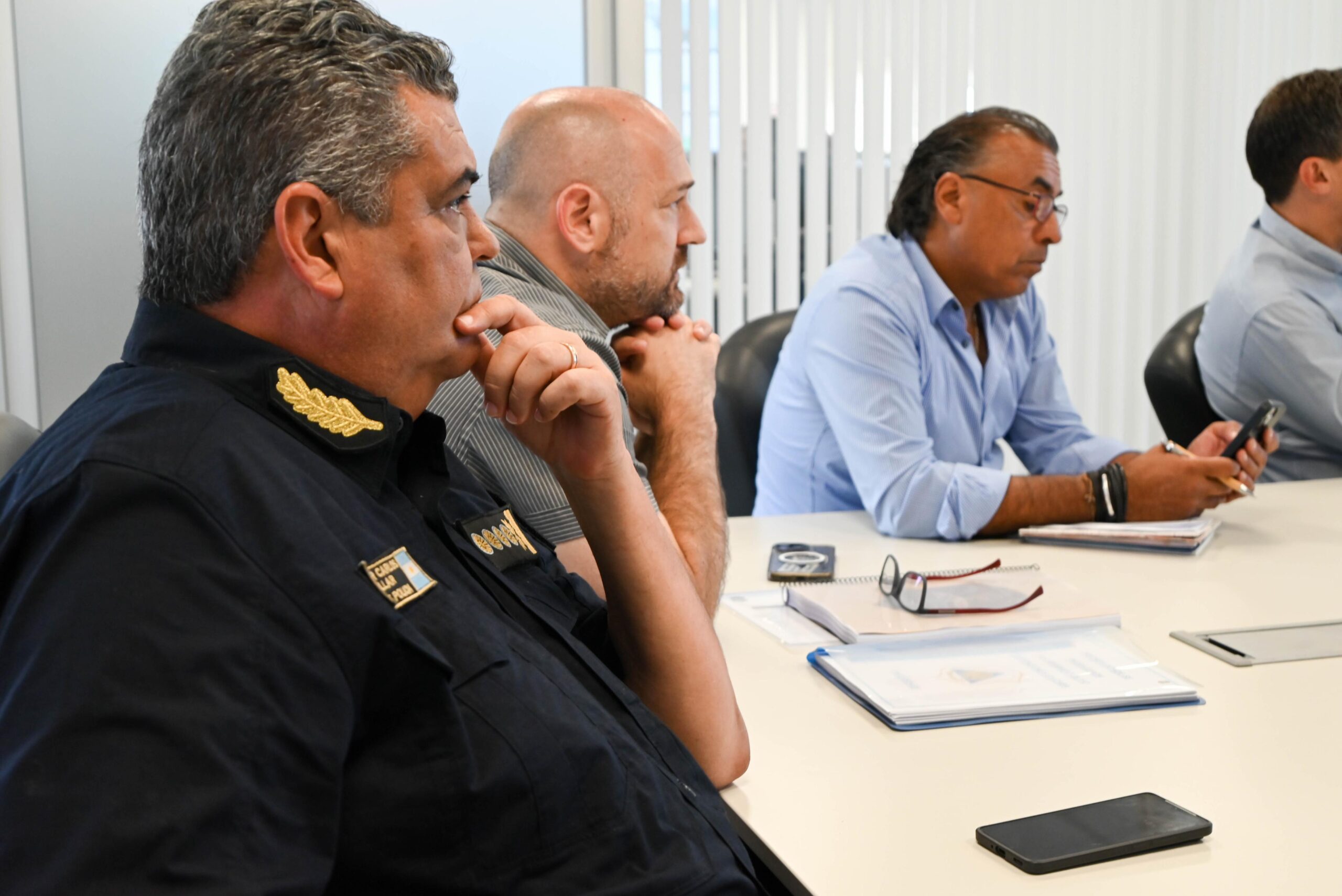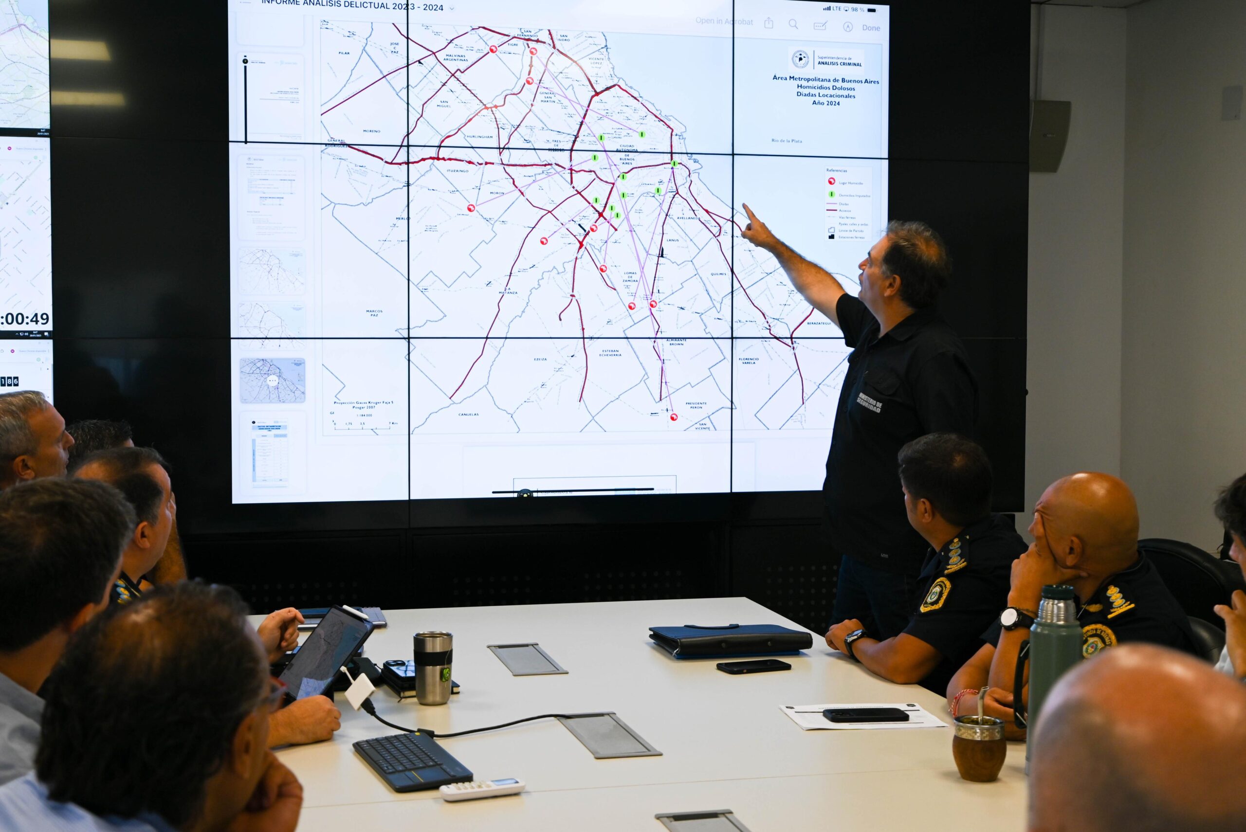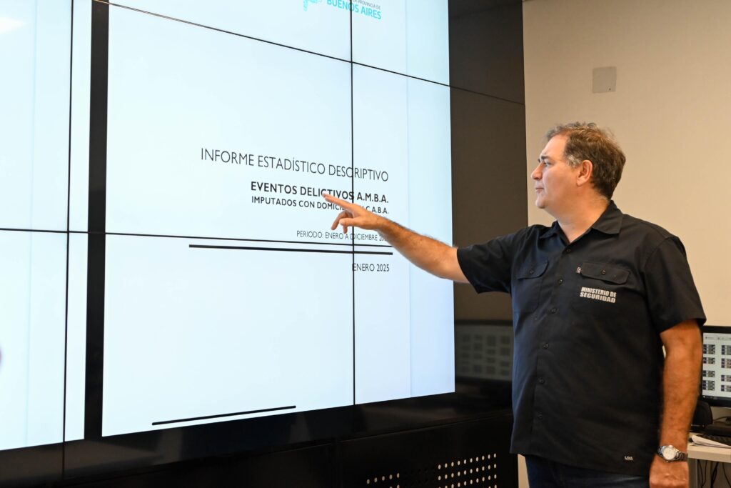 En la Sala de Situaciones de Multiagencia, se llevó a cabo una importante reunión de trabajo que contó con la participación del Ministro de Seguridad de la Provincia de Buenos Aires, Javier Alonso, junto al Subsecretario de Planificación e Inteligencia Criminal, Sebastián Fernández Ciatti; el Subsecretario de Articulación Institucional para la Seguridad, Eduardo Aparicio; el Subsecretario de Fiscalización y Control Policial del AMBA y Capital, Andrés Escudero; el Subsecretario de Formación y Desarrollo Profesional, Ignacio Pacho, y el Subsecretario de Tecnologías Aplicadas a la Seguridad, Mauricio Idiart Facetta, además de integrantes de la cúpula de la Policía de la Provincia, encabezada por el Comisario General Javier Carlos Villar.