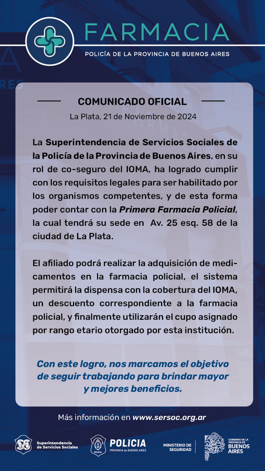 La Superintendencia de Servicios Sociales de la Policía de la Provincia de Buenos Aires en su rol de co-seguro del IOMA, informa a sus afiliados que, tras varios meses de trámites y gestiones administrativas, finalmente ha logrado cumplir con los requisitos legales para ser habilitados por los organismos competentes, y de esta forma poder contar con la Primera Farmacia Policial, la cual tendrá su sede en el local de Av. 25 esq. 58 de la ciudad de La Plata.