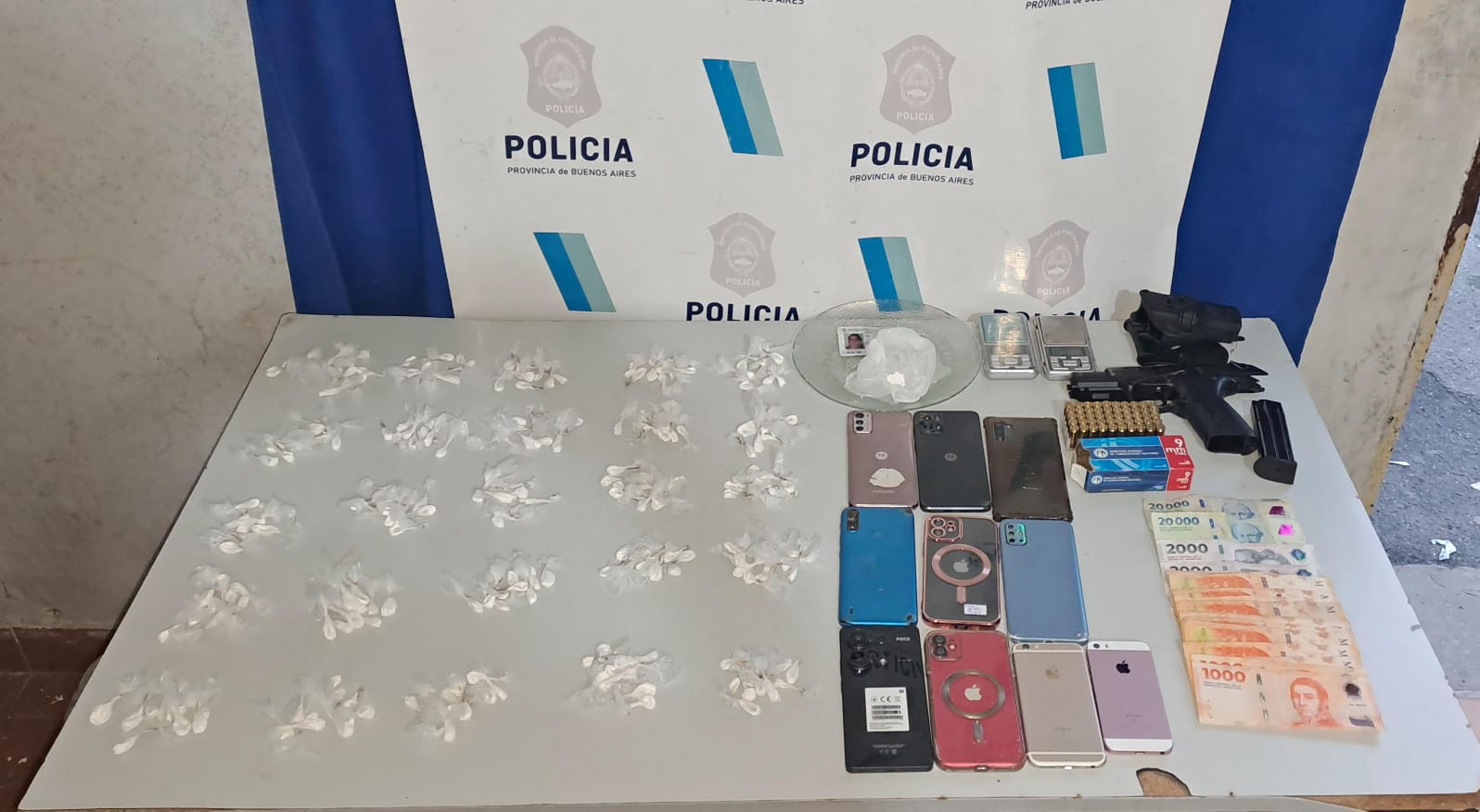 Secuestro de 250 envoltorios de nylon color blanco conteniendo un total de 80,5 Grs. de Clorhidrato de Cocaína, 02 balanzas de precisión, 10 teléfonos celulares y 1 Pistola marca Pietro Beretta Cal. .9 mm. con cargador colocado con 10 proyectiles mismo calibre inactos y una caja con 40 municiones Cal. .9 mm., dinero en efectivo