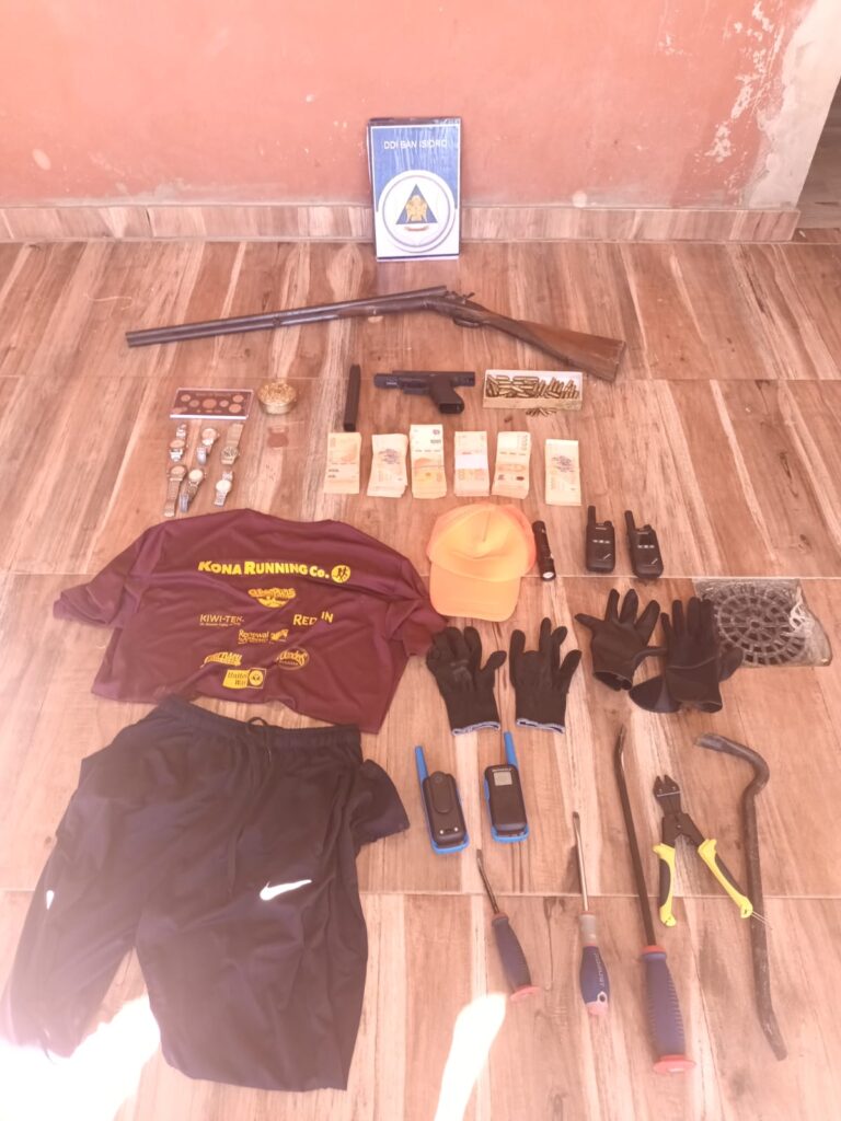 Diligenciadas las mandas, se logró la aprehensión de MEDINA y detención de LEMOS, sec. _pistola Glock 9mm, escopeta Nro 181597, vestimenta utilizada el día del hecho, 4 handyes, 2 guantes, 9 relojes, $1.838.280, 31 proyectiles cal 9mm, barretas, linterna, elementos de corte, 7 celulares, 4 plantas de marihuana, €70, U$S150 y 2 mochilas.