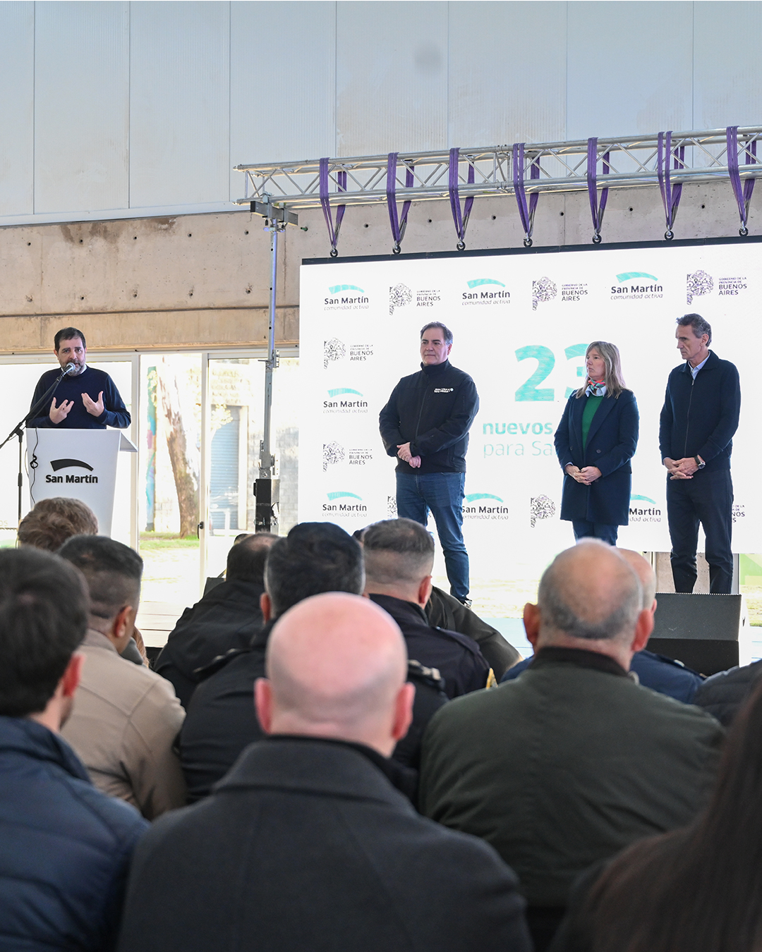 Estuvimos en San Martín junto al intendente Fernando Moreira, el ministro de Infraestructura Gabriel Katopodis y la jefa de Asesores Cristina Álvarez Rodríguez para entregar nuevos móviles y motos policiales destinados a reforzar el patrullaje preventivo en el distrito.