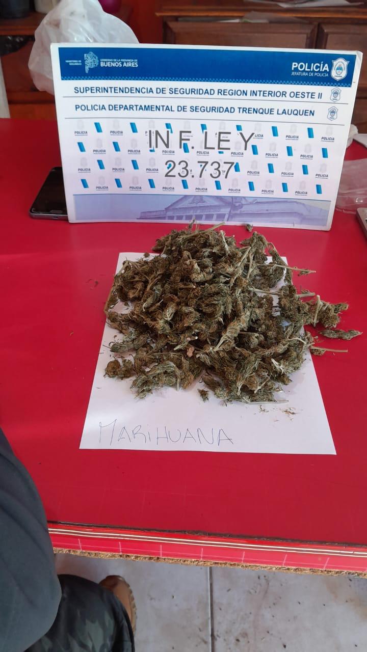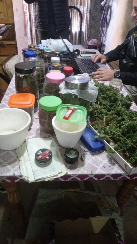 Fecha y hora Actual, se llevan a cabo dos allanamientos raíz denuncia realizada ALEXANDER V. (22), modalidad arrebato. Tareas realizadas por GTO Cria. 1ra. T. Lauquen, dando cumplimiento a lo dispuesto por S.S. para con domicilios imputados ROMERO, JOEL AGUSTÍN (20) y SENEGA, LUCAS BRAIAN (20) arrojando resultado positivo, objetivo 1: incautado un teléfono celular, 29 frascos conteniendo Marihuana, una rama con cogollos, y 3 plantas de marihuana (2 mts. altura). Total 1,201 hilos. Objetivo 2 se incauta 74,85 gramos de cogollos de marihuana.- Objetivos allanados guardan relación Causa estupefacientes iniciada por esta Policía fecha 01/03/24 bajo PU Nro. 70923. Imputados not. Art. 60 CPP