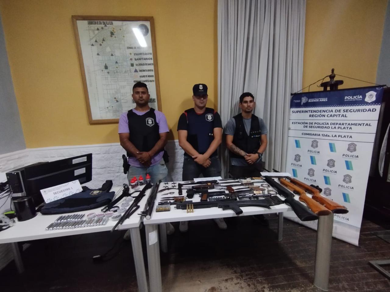 SINTESIS DEL HECHO: Cumplo en llevar a conocimiento del Sr Jefe que con fecha 21/01/25 en virtud de publicaciones en redes sociales (Facebook e Instagram) en una cuenta identificada como «nosotros_somos_el_corte80», al menos tres masculinos hacían publicaciones exhibiendo y esgrimiendo armas de fuego, del tipo escopeta, pistolas, e inclusive chalecos antibalas pertenecientes a la policía de la Provincia de Buenos Aires, por lo que personal del GTO inicia de oficio la investigación, logrando identificar a las personas involucradas, elementos que además eran ofrecidos en alquiler por medio de las redes sociales con fines ilícitos. Ante ello se requirió sendas órdenes de registro domiciliario y secuestro, las cuales fueron expedidas en el día de la fecha. Es así que se generó orden de servicio y con el apoyo de otros GTO de comisarías que conforman la EPSD LP, se efectivizaron las ordenes judiciales lográndose incautar los elementos mencionados ut supra y en consecuencia se procedió a la aprehensión de los tres sujetos implicados. Se mantuvo comunicación con el Fiscal de intervención, quien avalo lo actuado, disponiendo la aprehensión de los mencionados. De corresponder ampliaré por separado.