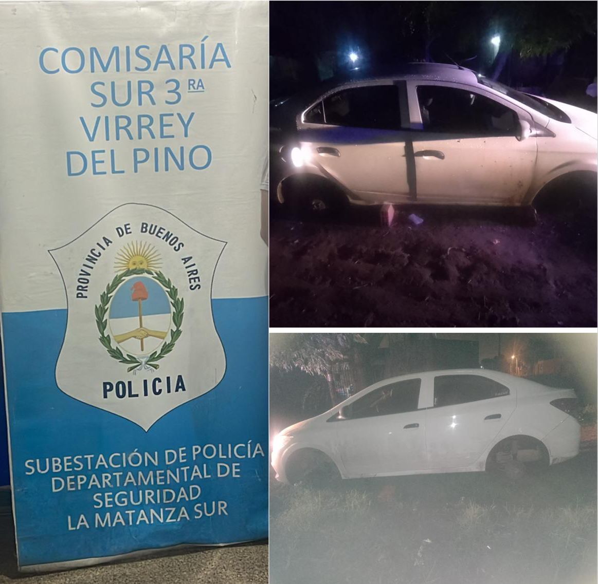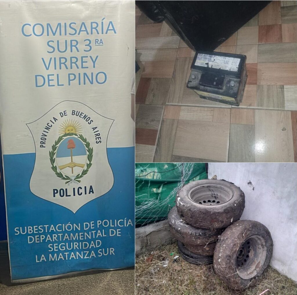 Fecha, Personal policial arriba a la intersección de las calles Aromas y Cañuelas donde establece en estado de abandono la presencia de Vehículo Chevrolet Prisma Ptte AC-836-UN con faltante de ruedas y batería, el cual fuera recientemente sustraído a la víctima Antonio E. Que en el lugar una vecina le refiere que dos masculinos estaban en su finca, con las ruedas del auto, por lo que personal policial precede al ingreso y aprehensión de los causantes Dylan Guillermo G. de 16 años y Diego Alberto E. de 15 años, y a la incautación de Cinco ruedas y una batería de vehículo, faltantes de la unidad sustraída a la víctima.